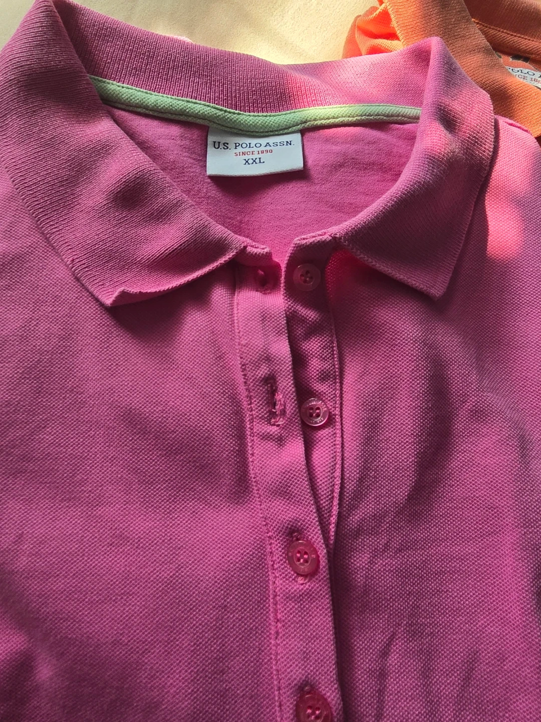 Two U.S. Polo Assn. shirts for sale! One is a vibrant pink in size XXL, and the other is a stylish coral color with a floral print inside the collar, sized XL