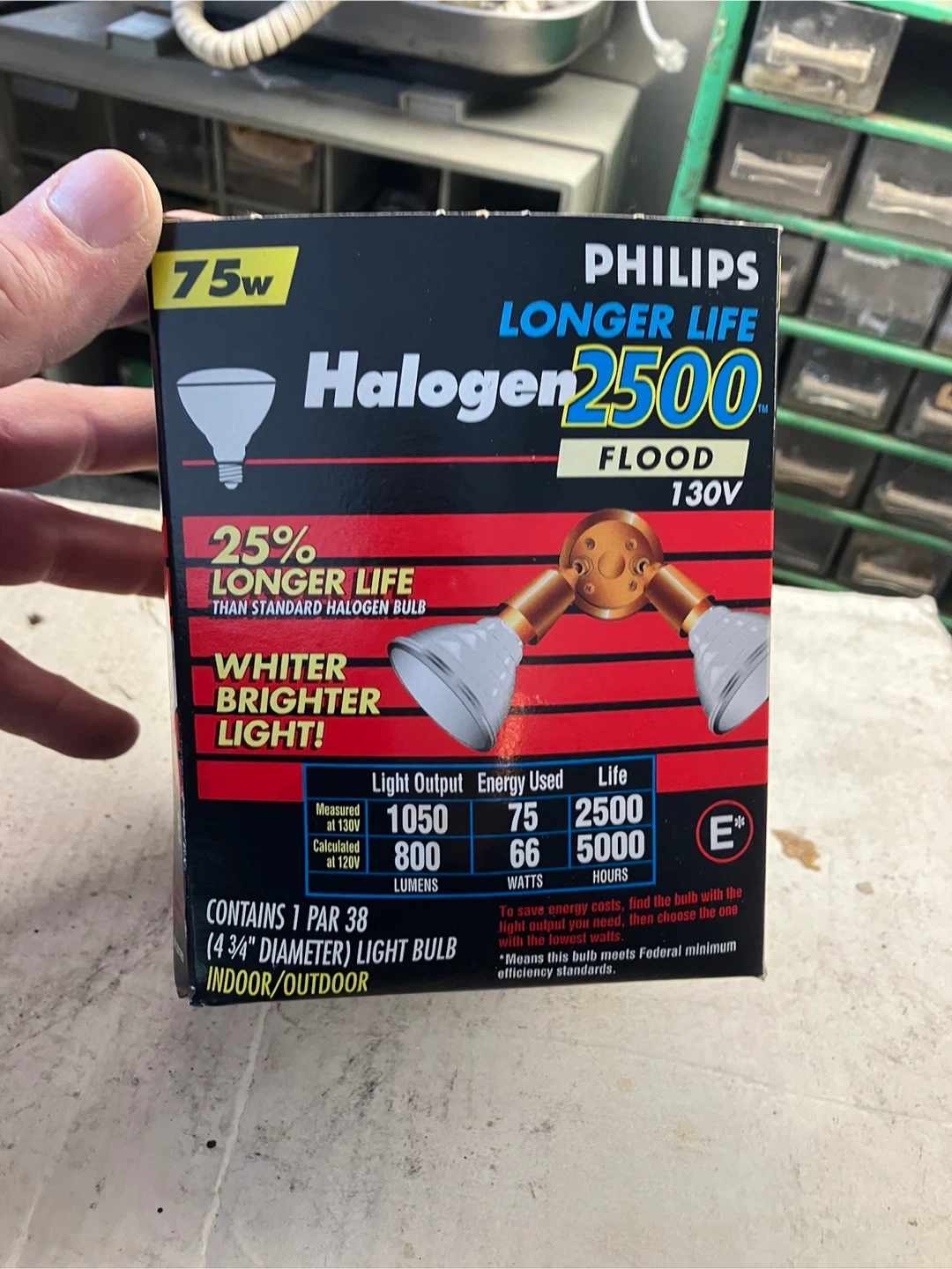 - Philips: 75W Halogen2500 Flood 130V, Longer Life, Whiter Brighter Light, contains 1 PAR 38 (4 3/4" diameter) light bulb indoor/outdoor
