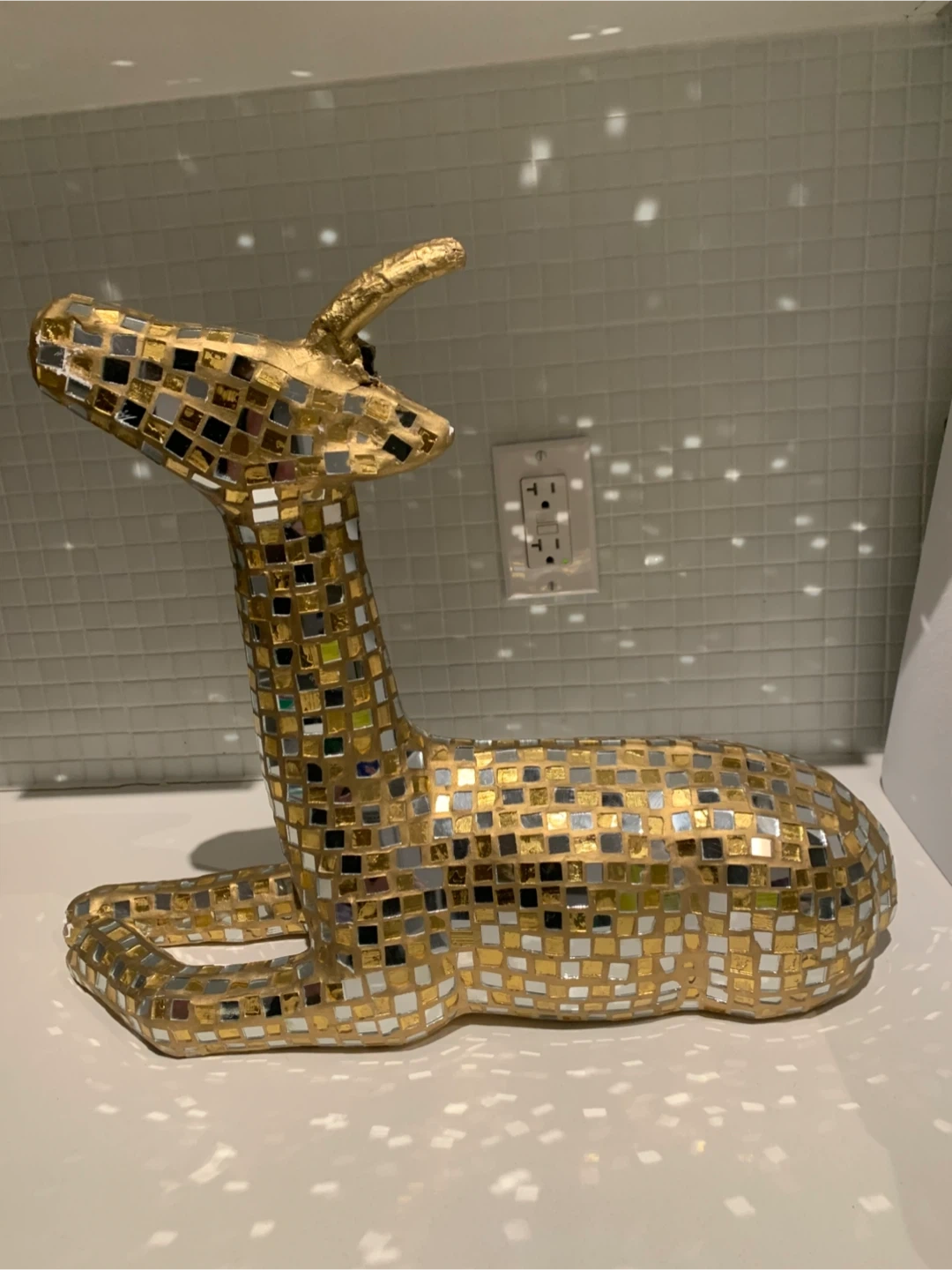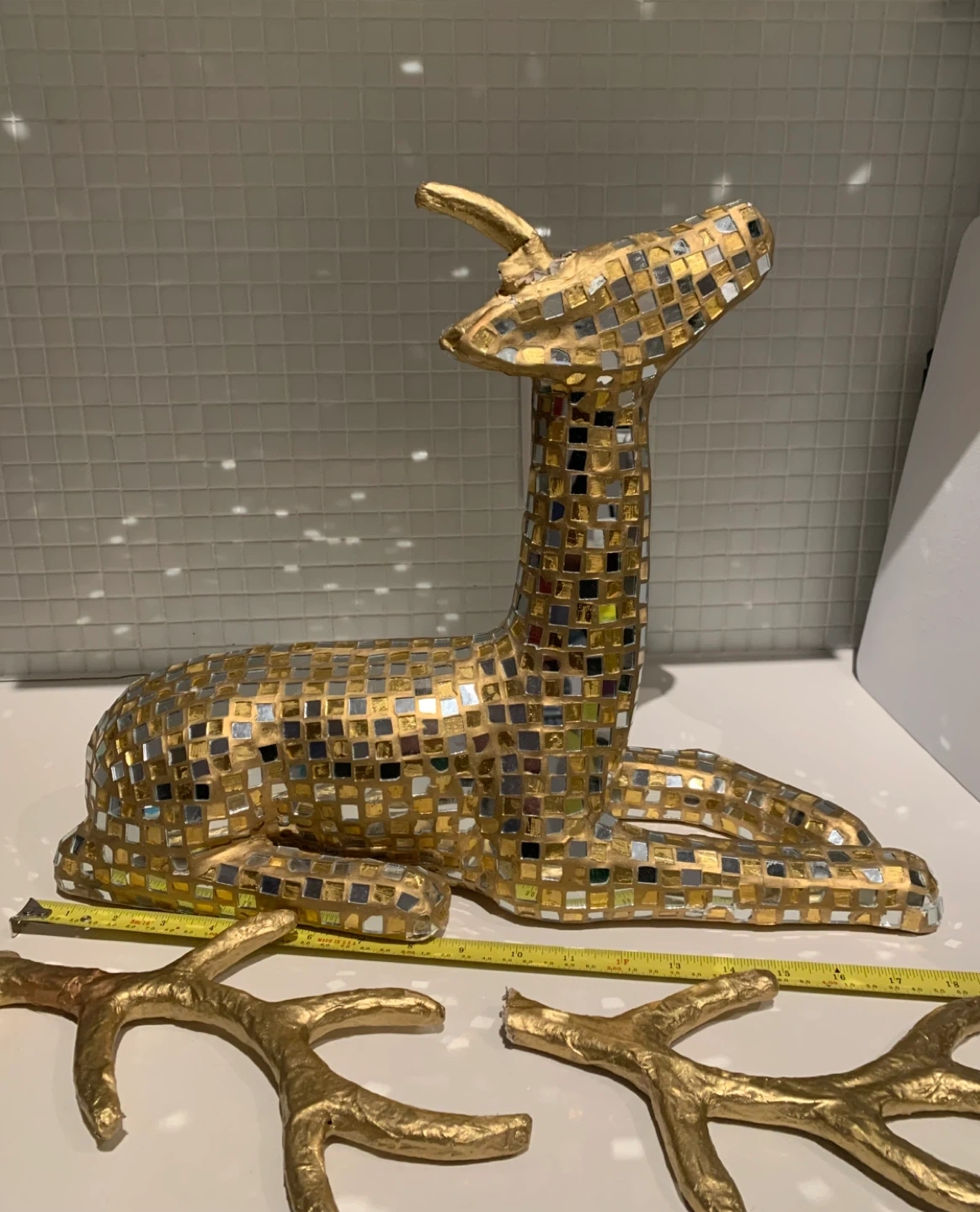This is a unique gold mosaic deer large decoration that would look great in any room!, especially during the Holidays! The striking projection of light is mesmerizing. The set of antlers needs to be glued back (my little nephew taught it was a toy lol). Other than that It's in good condition.