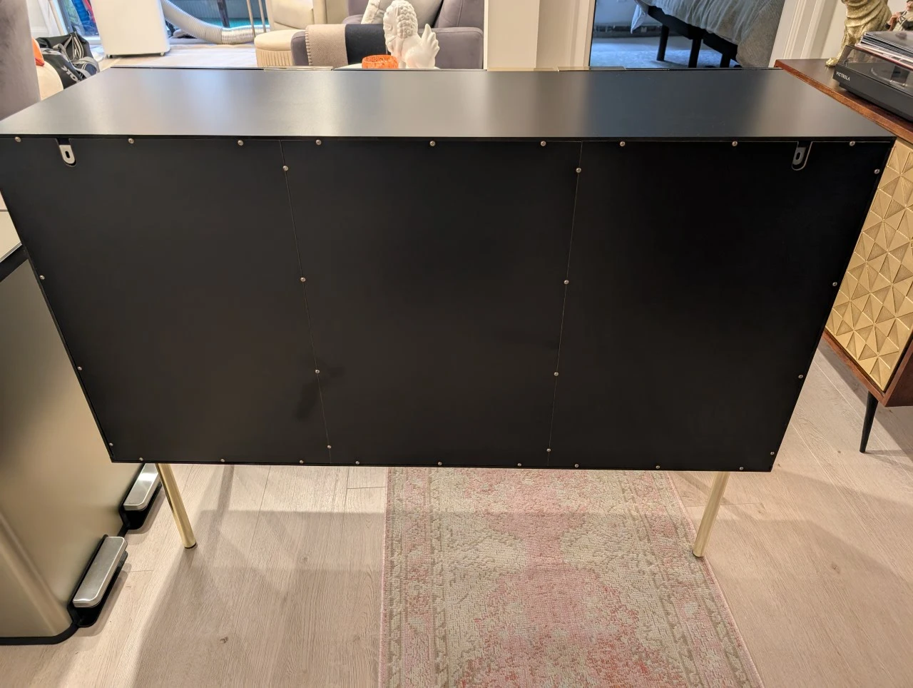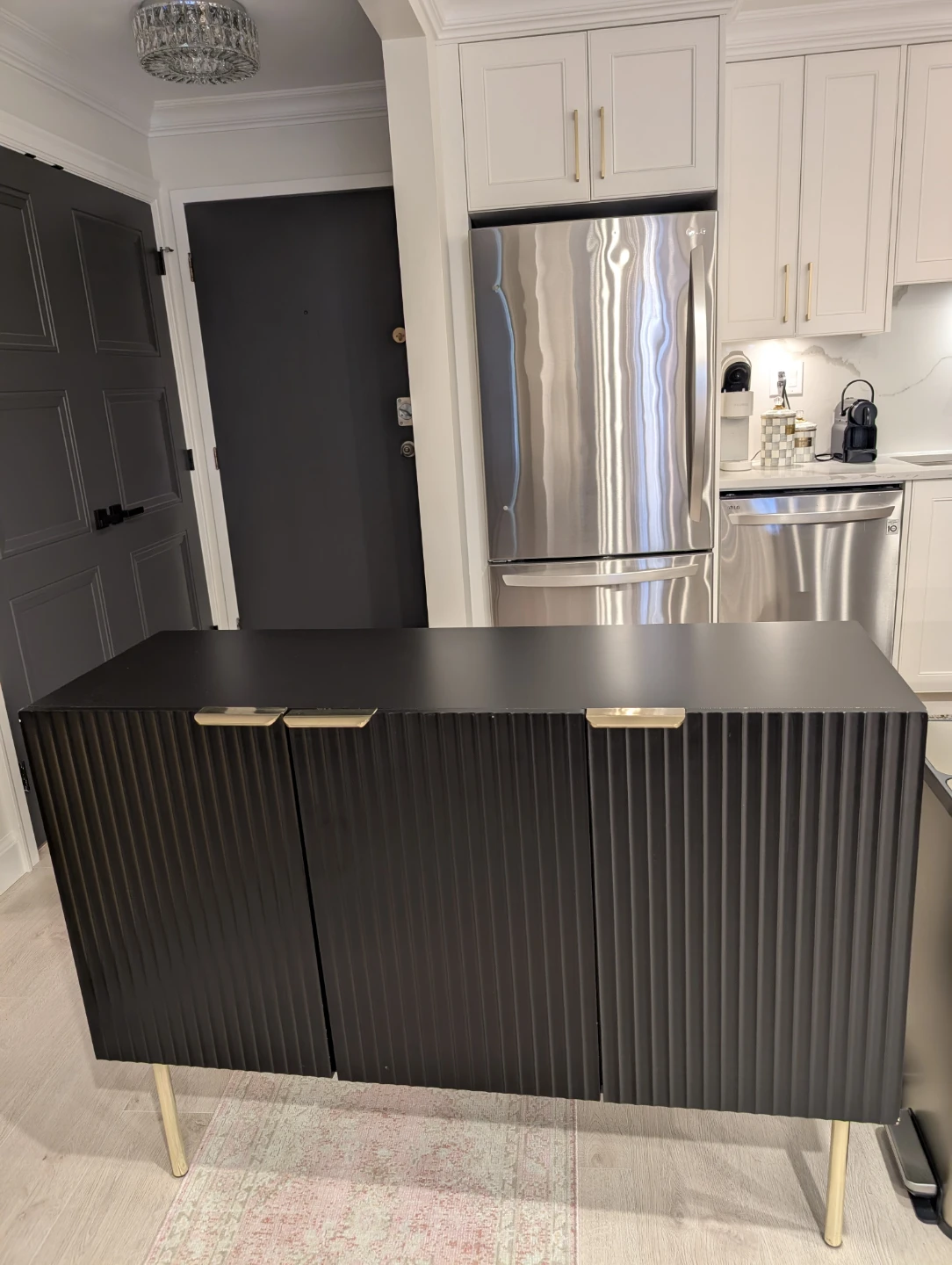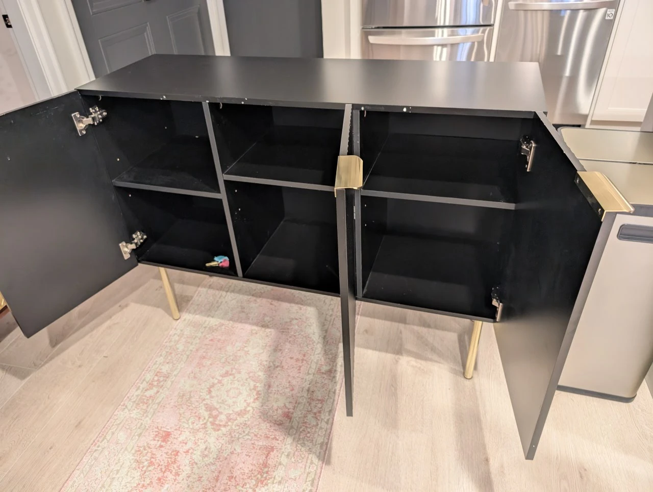 Selling a stylish black liquor / storage cabinet. It has a chic design with gold accents, making it a great addition to any room. It features multiple shelves for ample storage space. Perfect for organizing your bottles, glassware, and more. It is a beautiful piece that we need to sell due to moving.