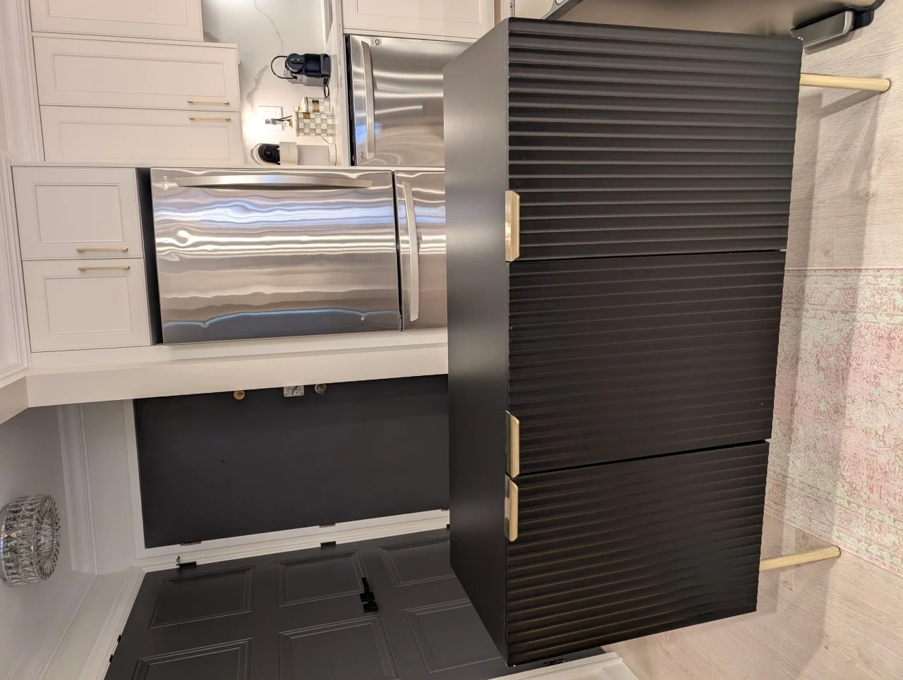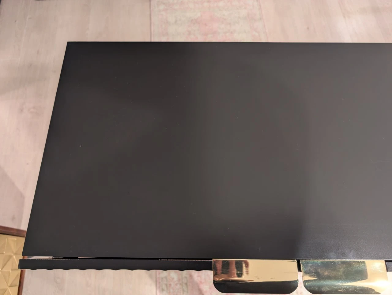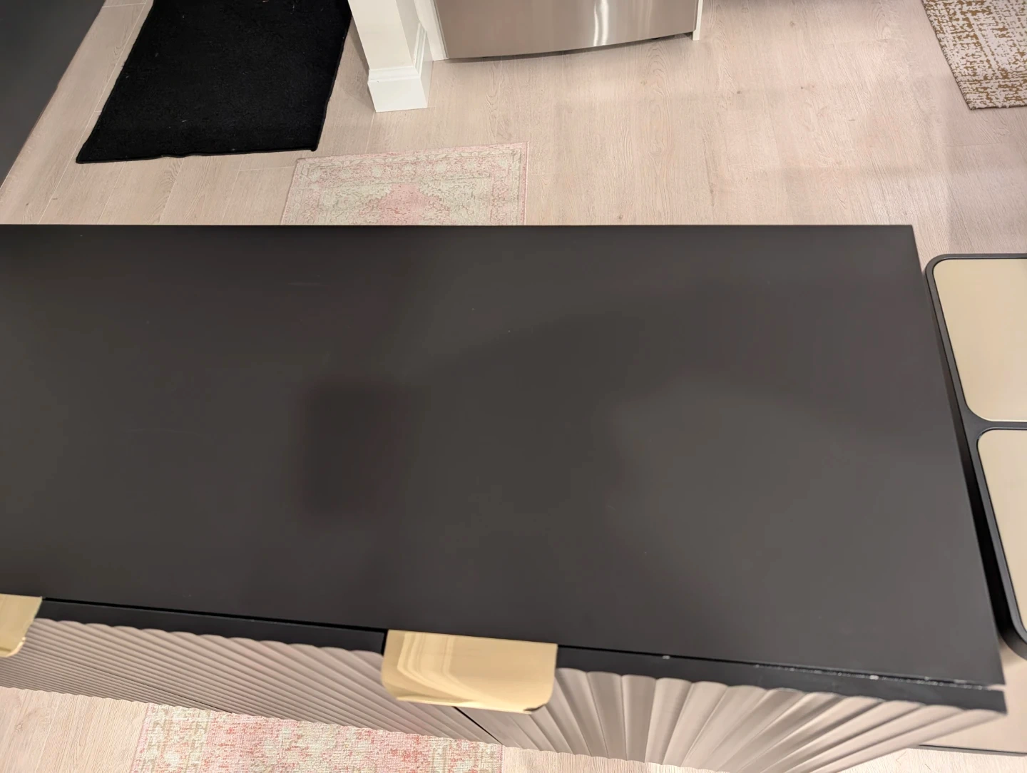 Selling a stylish black liquor / storage cabinet. It has a chic design with gold accents, making it a great addition to any room. It features multiple shelves for ample storage space. Perfect for organizing your bottles, glassware, and more. It is a beautiful piece that we need to sell due to moving.