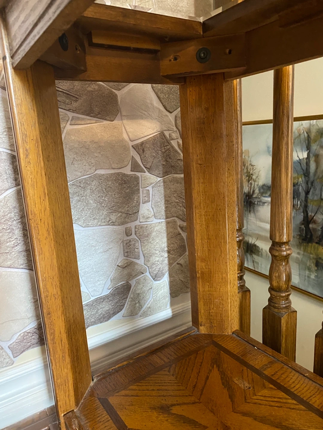 Selling a lovely vintage console table with a wood frame and glass top. It has a unique patterned wood design and a shelf underneath for extra storage. Perfect for adding a touch of classic style to your entryway or living room!