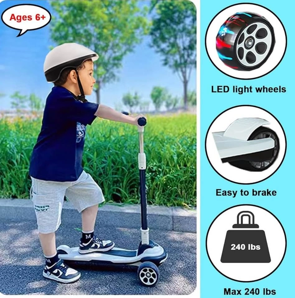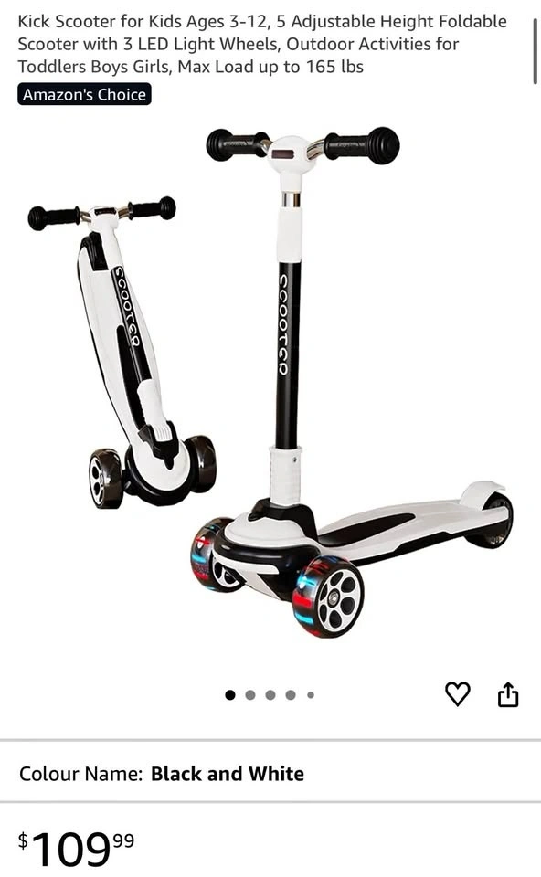 Brand new kids kick scooter with 3 LED light-up wheels. Features adjustable handle height, foldable design, and smooth, stable ride. Suitable for ages 3–12 and supports up to 165 lbs. Perfect for outdoor fun and easy to store or carry.
