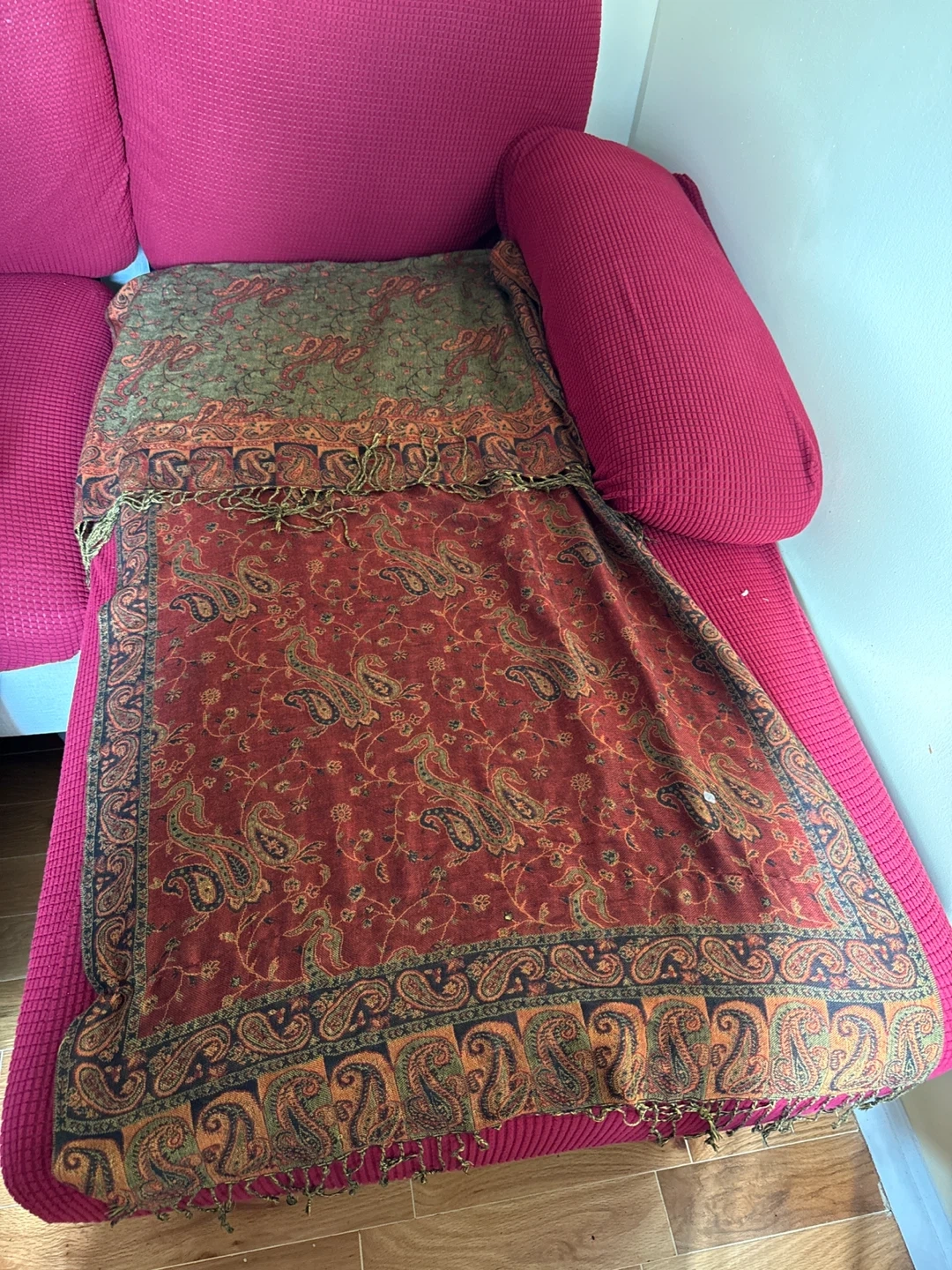 Beautiful paisley shawl with a unique pattern and fringed edges. The colors are rich and vibrant, perfect for adding a touch of elegance to any outfit or home decor