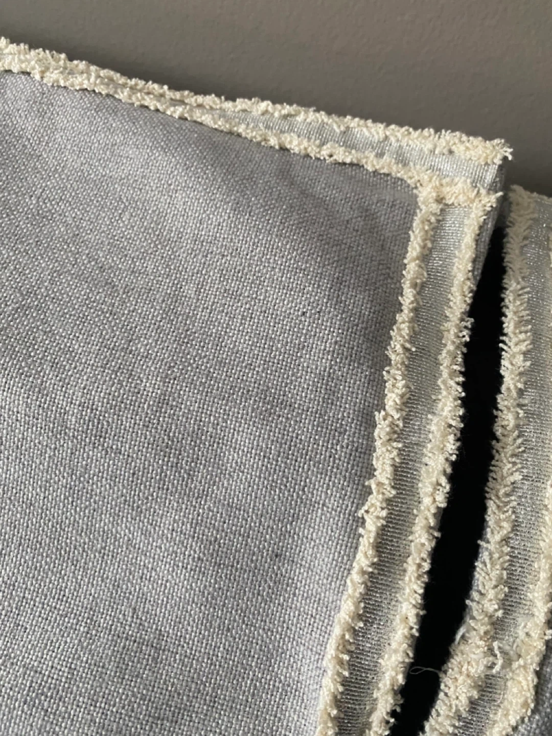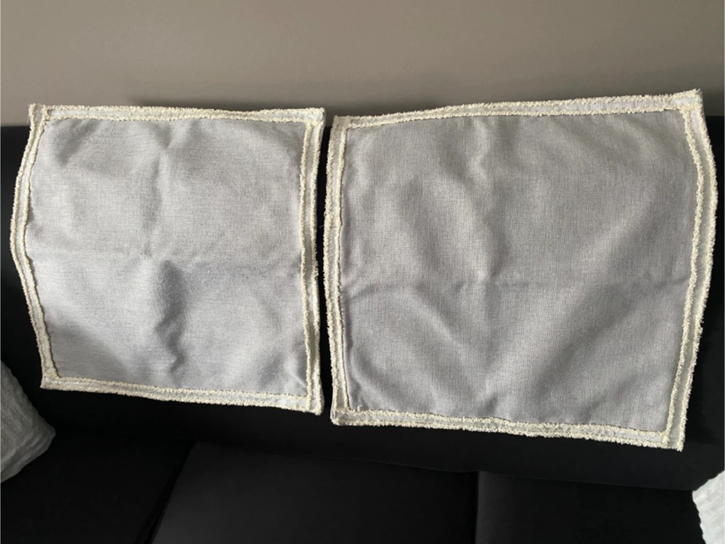 Selling two square pillow covers in a neutral grey colour with silver sparkly border. It's in great condition and would look great in any living room or bedroom!