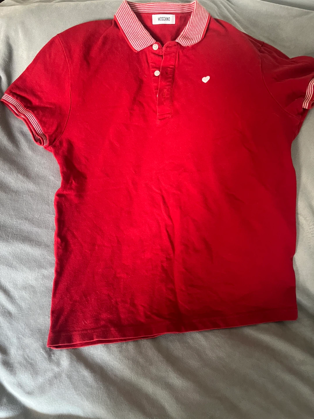 Selling a red Moschino polo shirt! It's in good condition and features a cute heart detail. Perfect for a casual look