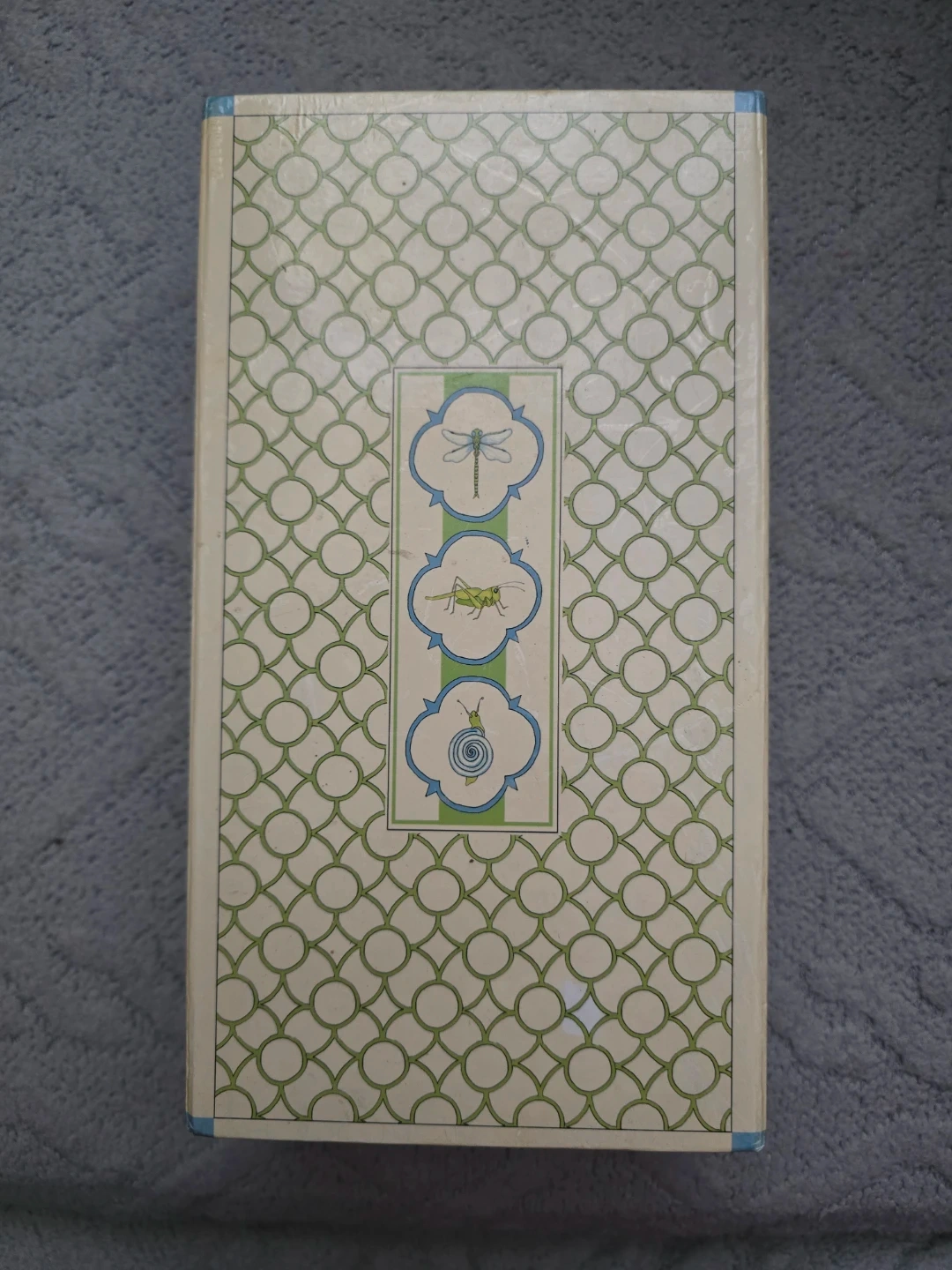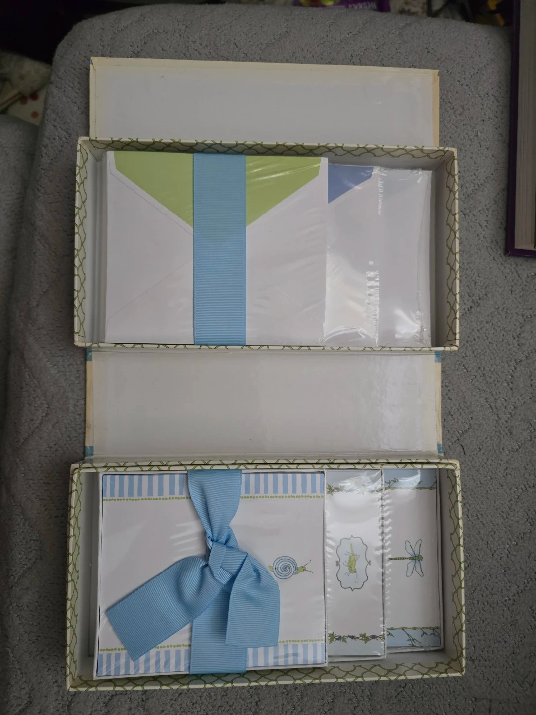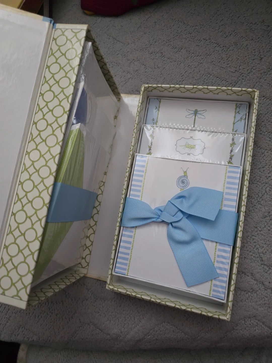 You'll get a lovely stationery set that comes in a decorative box. The set includes various cards and envelopes, all neatly organized. The box itself is quite charming, featuring a geometric pattern with cute insect designs. Perfect for anyone who enjoys sending handwritten notes!