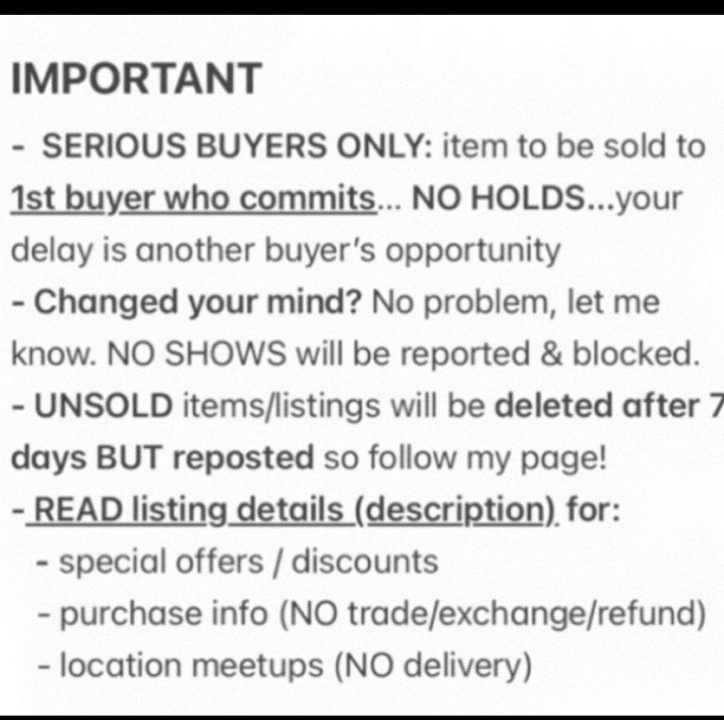 SERIOUS BUYERS ONLY / FINAL SALE / Cash Payment at pickup / NO HOLDS (Items will be sold on a FIRST-COME/PAYMENT-FIRST-SERVE basis!)