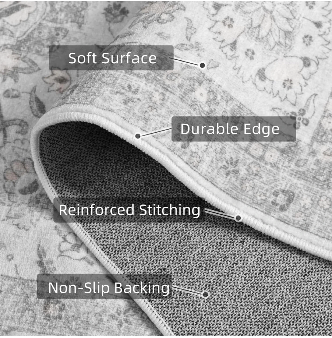 This area rug features a soft surface, durable edge, reinforced stitching, and non-slip backing. It's also machine washable and easy to spot clean!