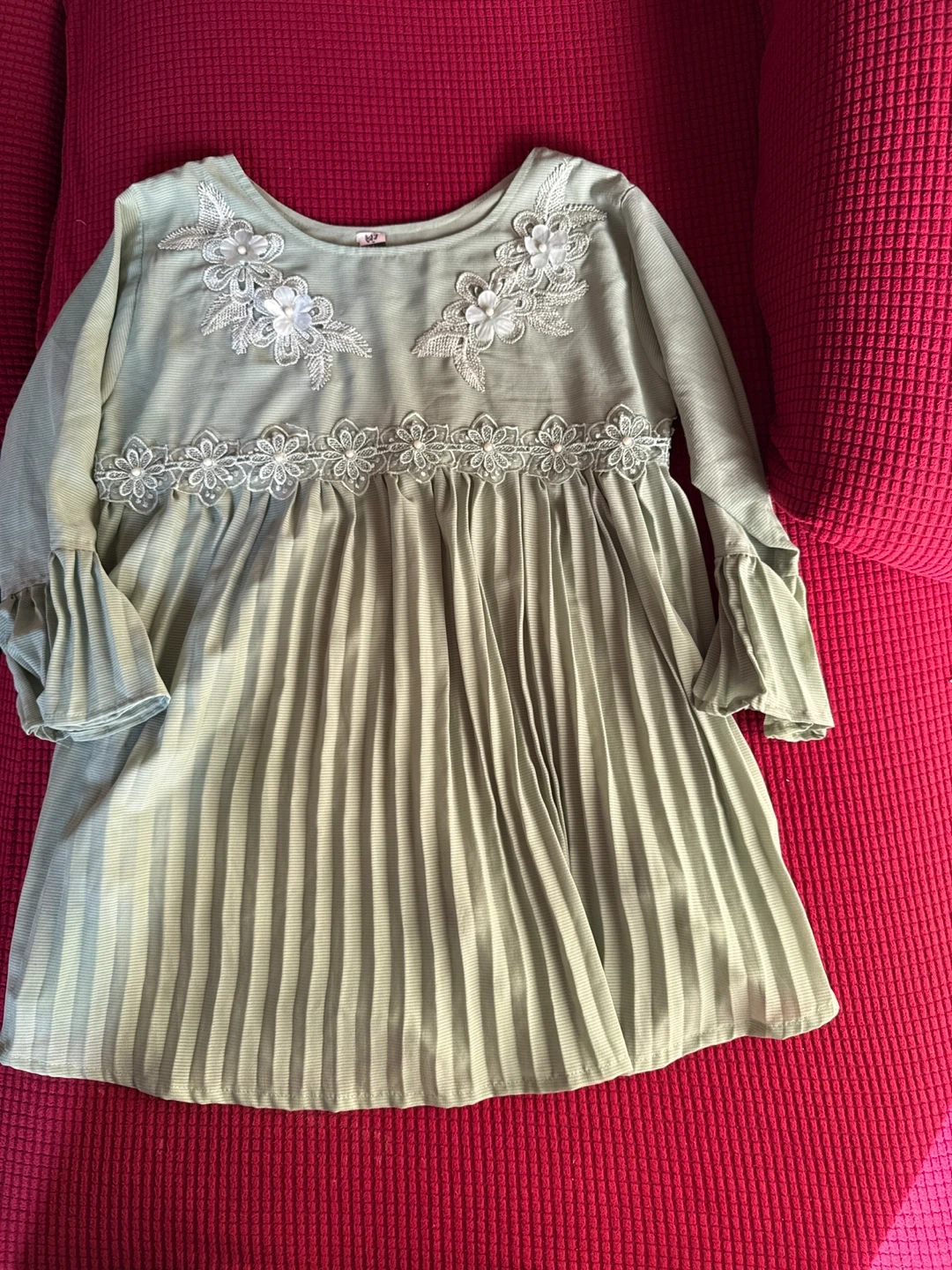 This is a cute green dress with floral details. It features long sleeves and a pleated skirt. Perfect for a special occasion or everyday wear!