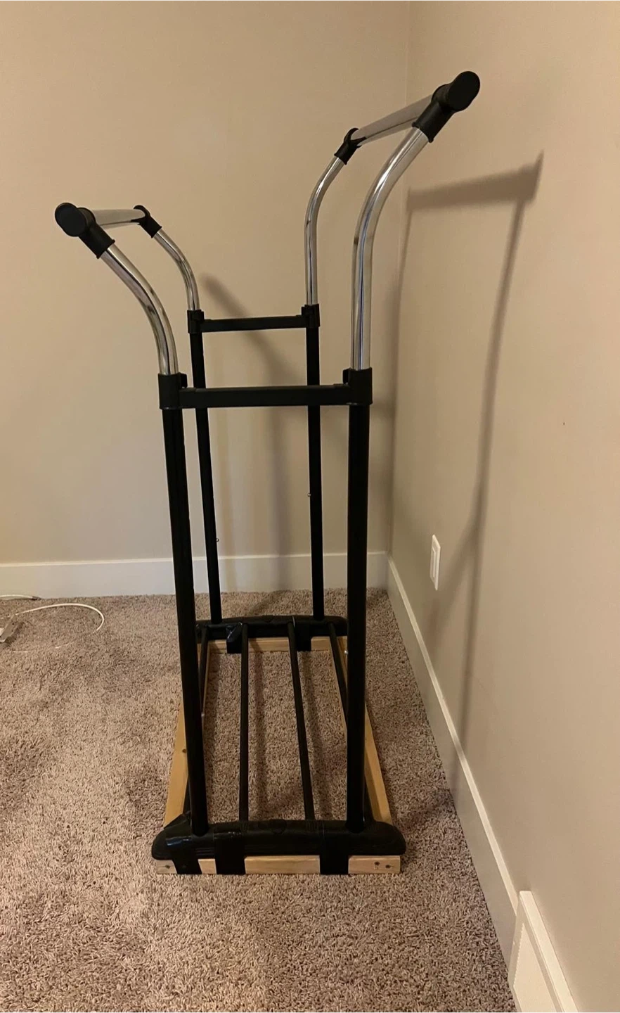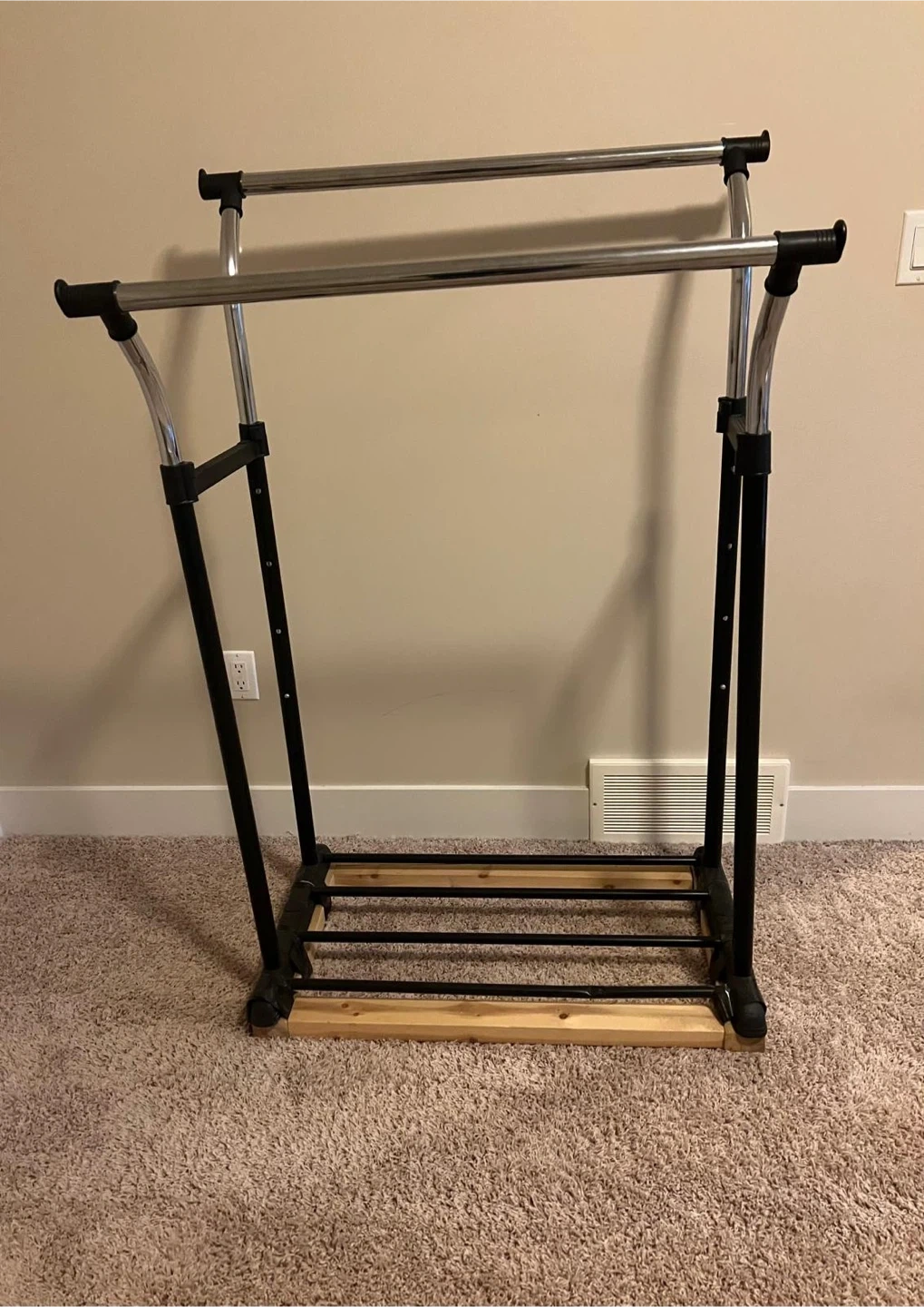 Selling an adjustable garment rack in black and silver! It's approximately 35”w x 52 1/2” L x 22 1/2” deep. There are 2x4’s on the base to provide enhanced sturdiness that does not come apart. The silver bars can be removed to make transporting easier. Perfect for adding extra storage space to your closet or laundry room.