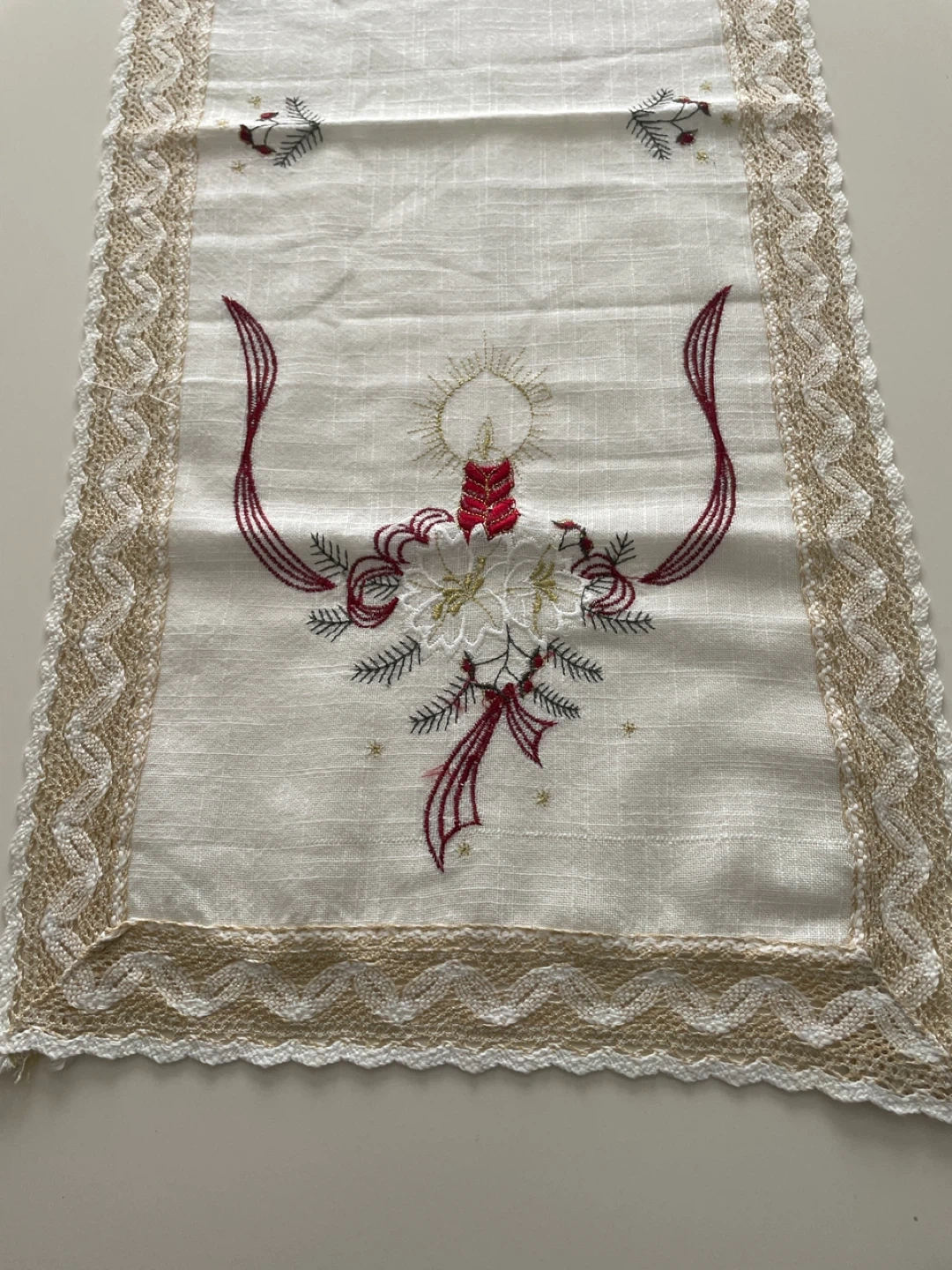 This is a beautiful embroidered table runner, perfect for adding a festive touch to your holiday decor! It features a lovely Christmas-themed design with candles, ribbons, and winter foliage. The edges are trimmed with delicate lace detailing. It's in great condition and ready to brighten up your home this Christmas season