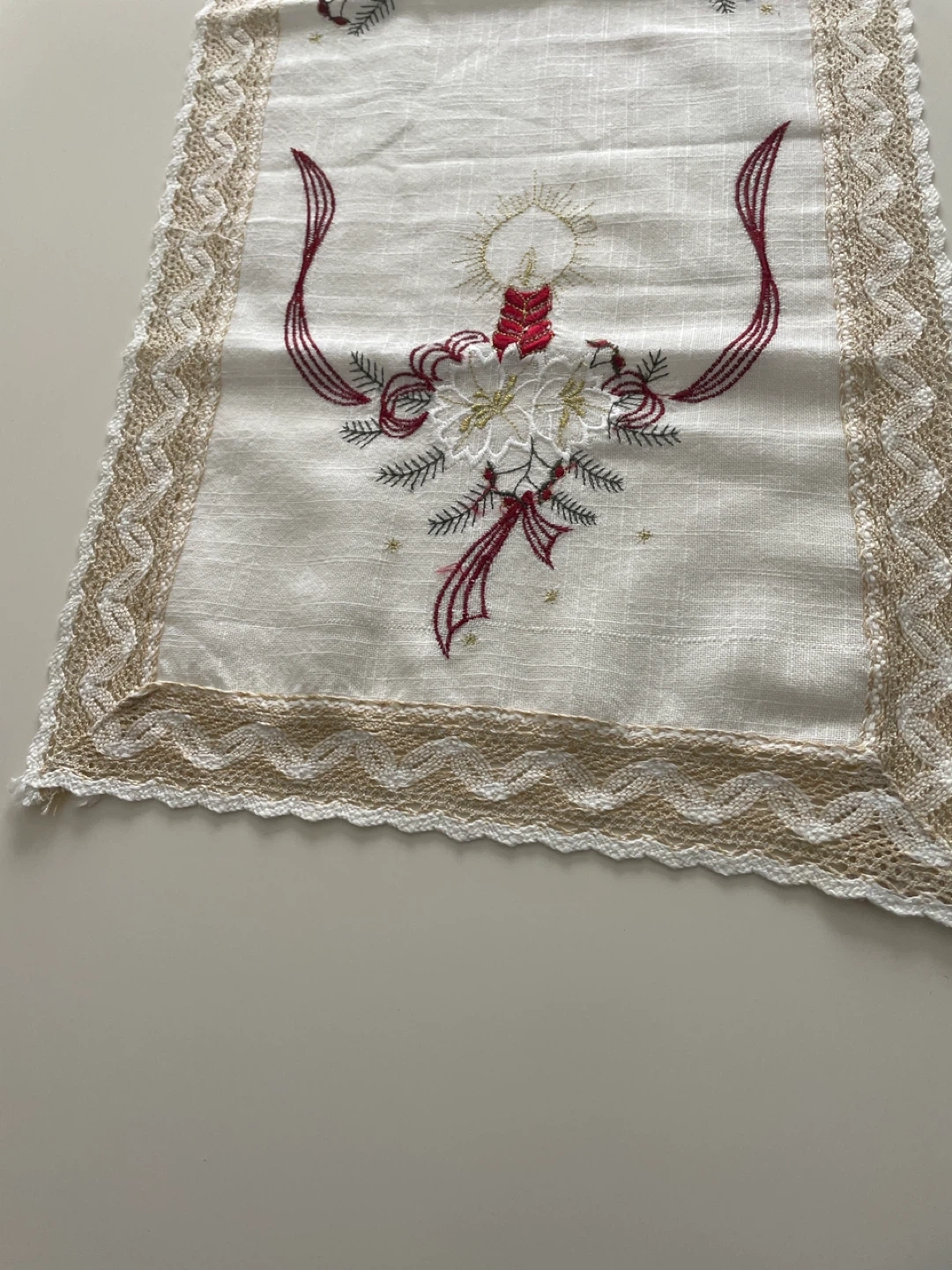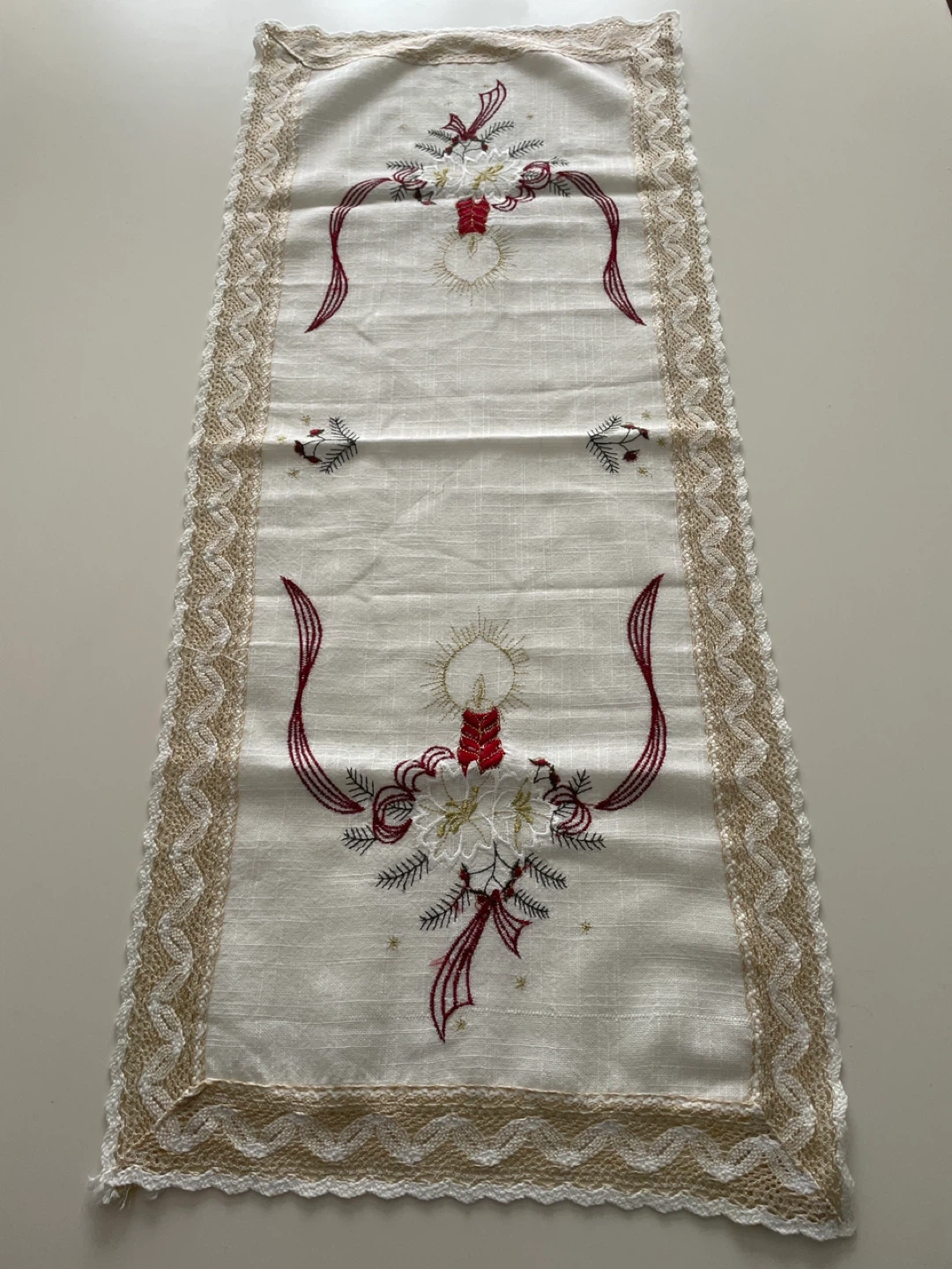 This is a beautiful embroidered table runner, perfect for adding a festive touch to your holiday decor! It features a lovely Christmas-themed design with candles, ribbons, and winter foliage. The edges are trimmed with delicate lace detailing. It's in great condition and ready to brighten up your home this Christmas season