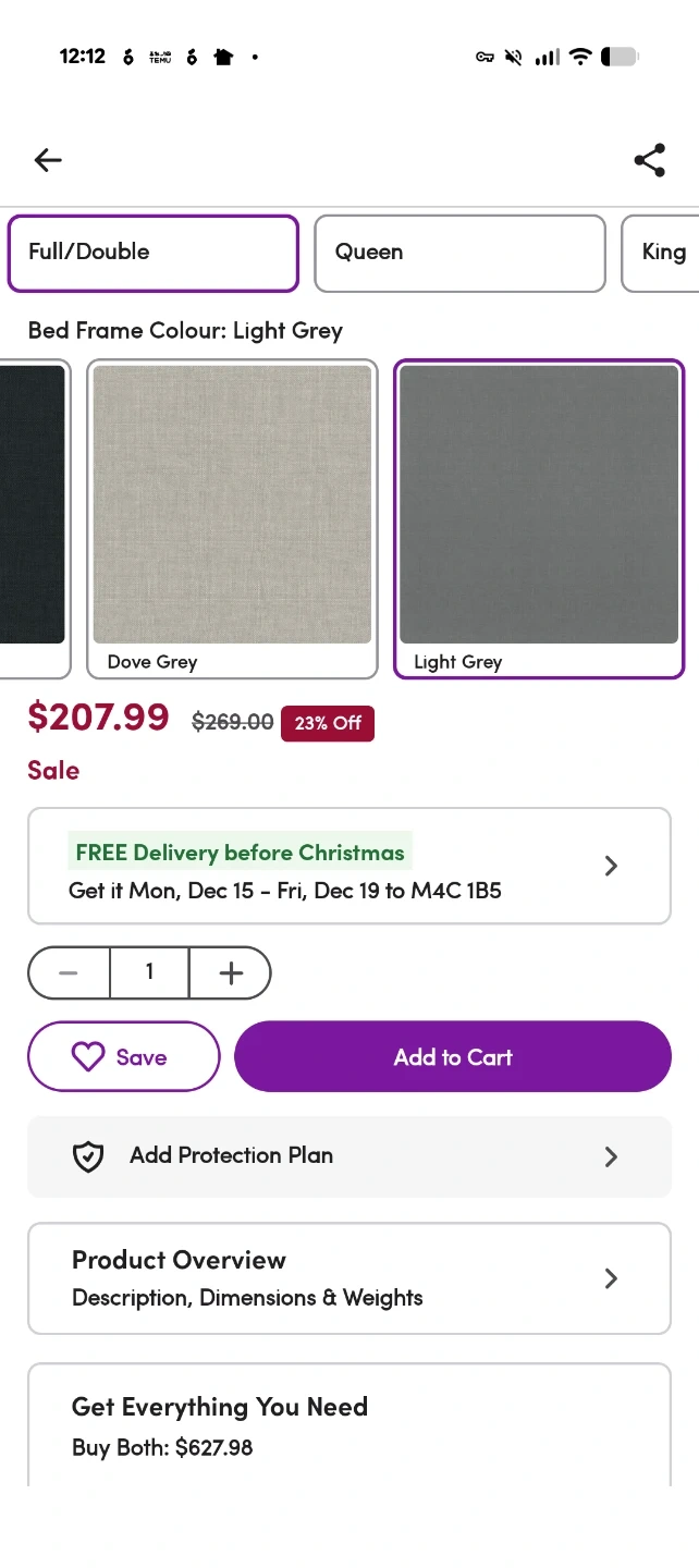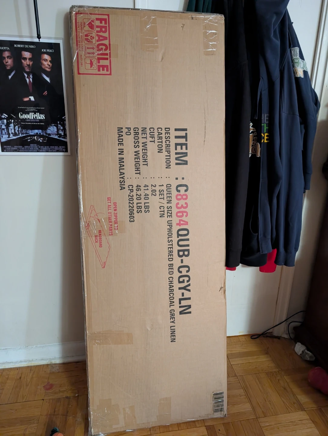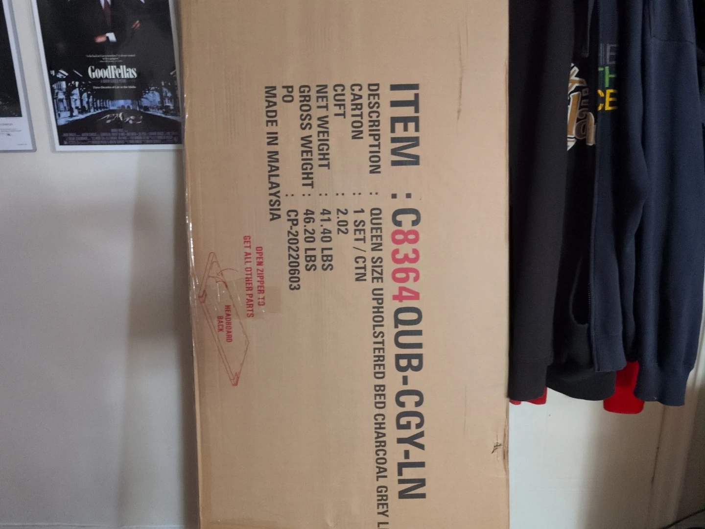Selling a queen-size upholstered bed from Ebern Designs! The colour is a lovely charcoal grey linen. The item is still in its original packaging. The original price was $207.99.