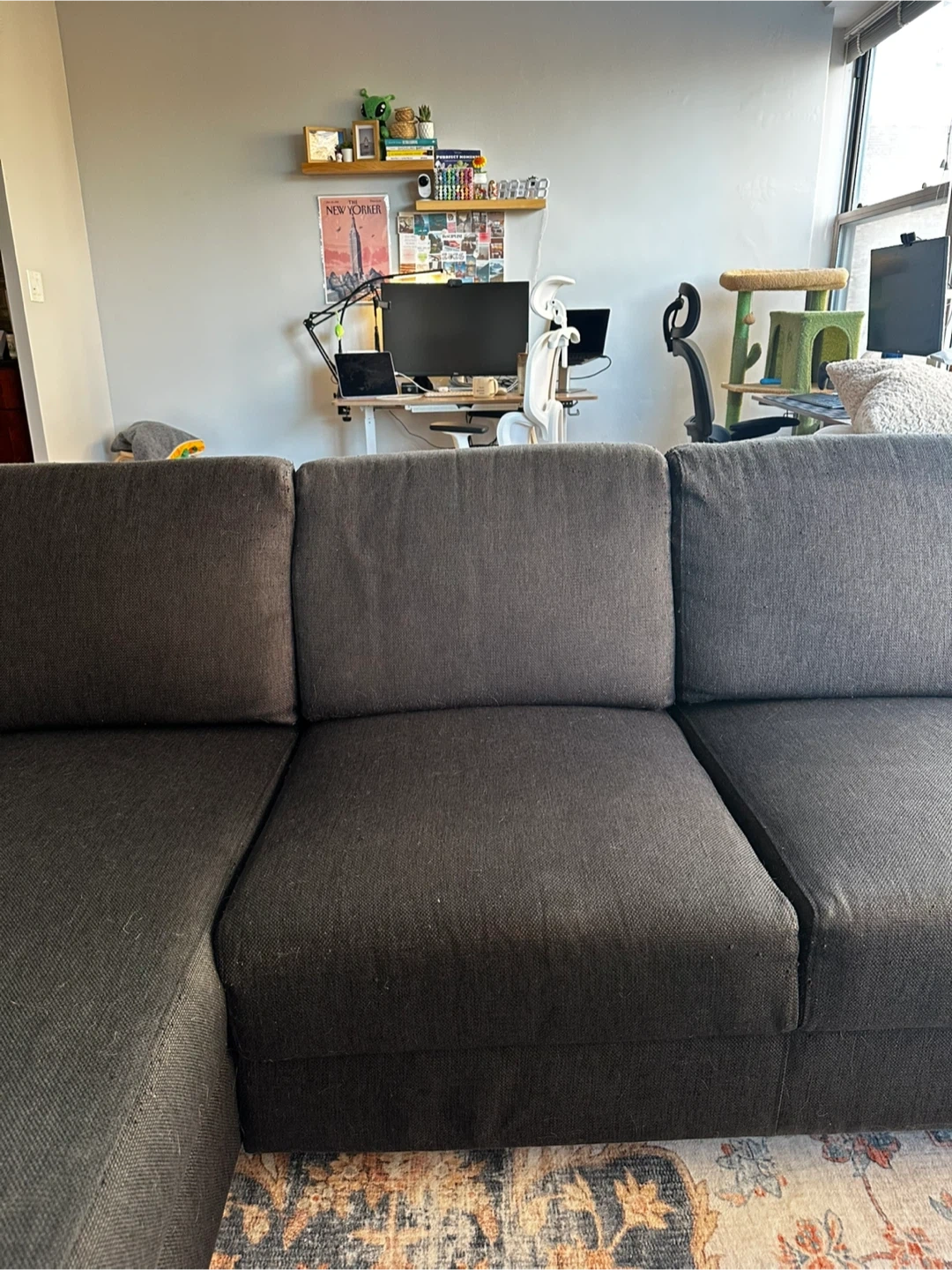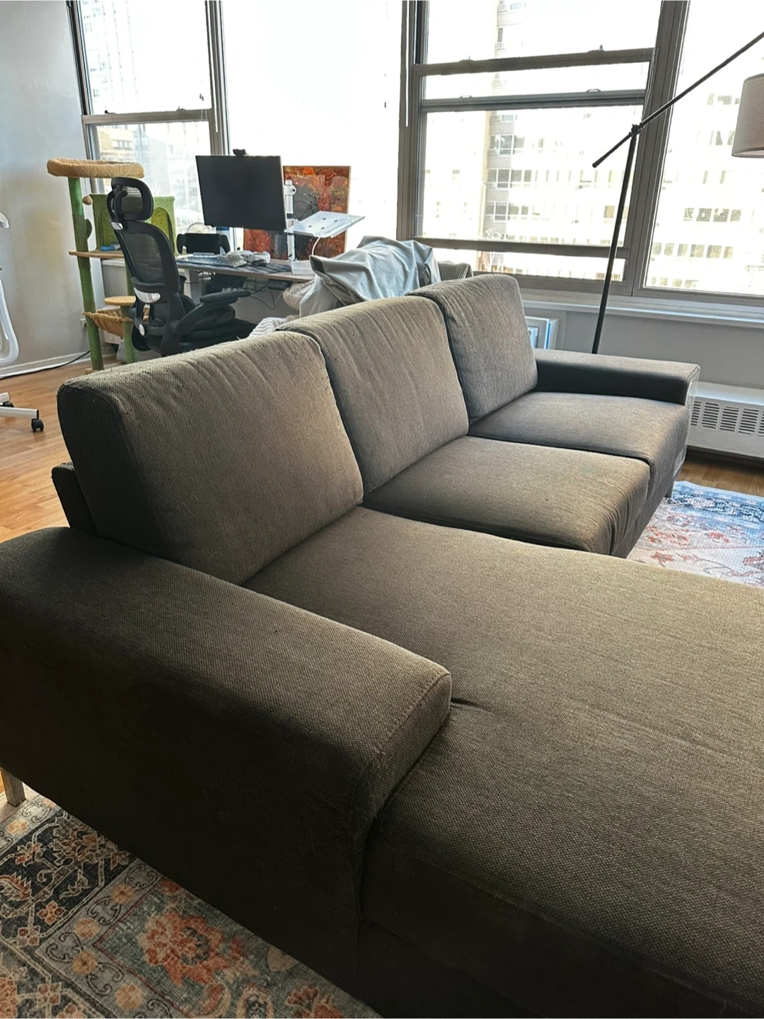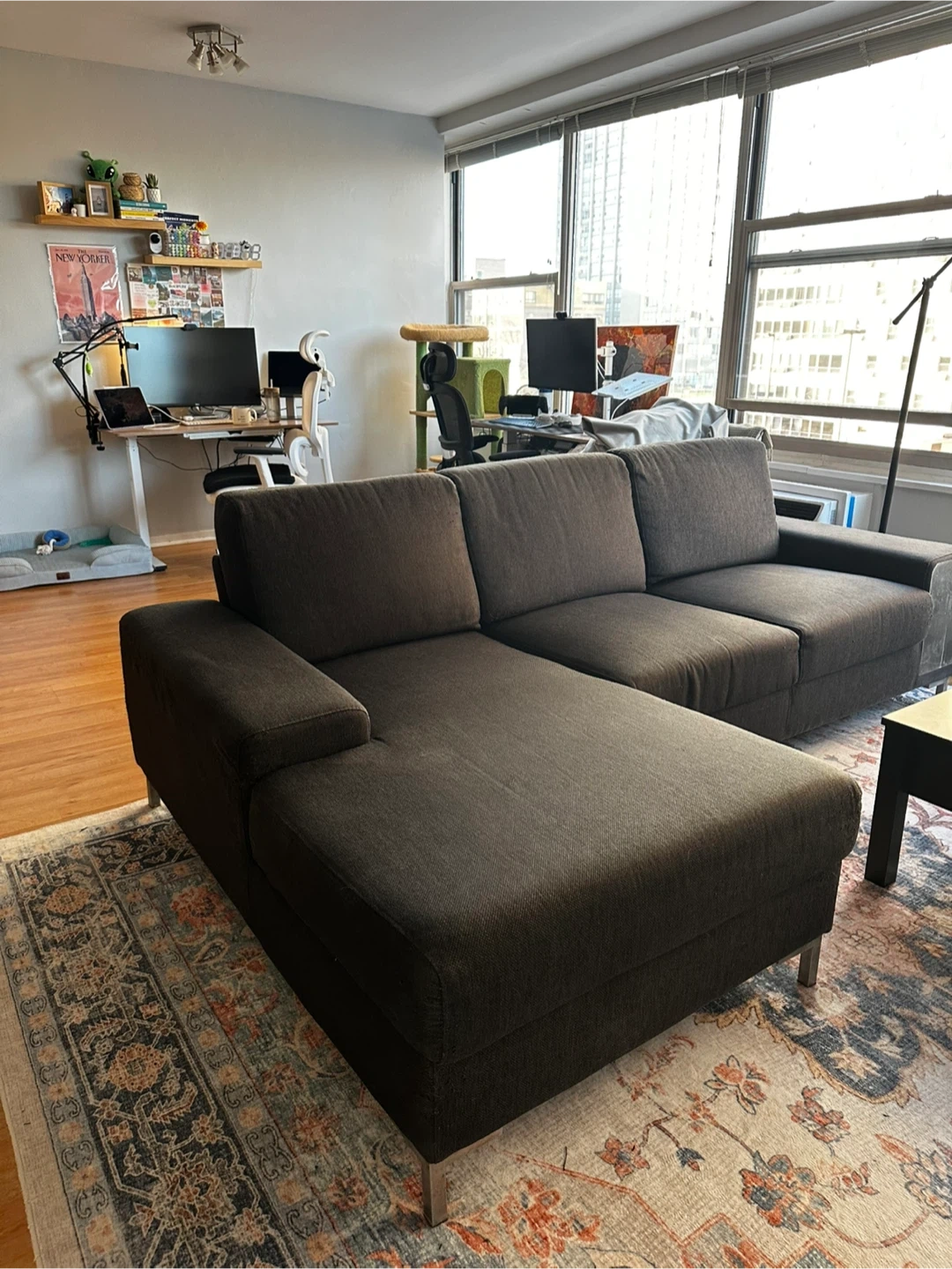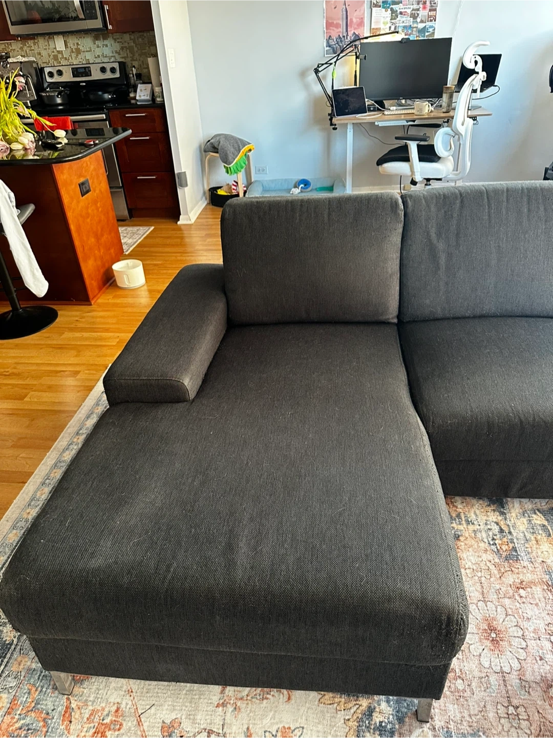 Comfortable dark gray fabric sectional sofa. It's a right-arm facing chaise with plenty of seating space. Comes with three accent pillows as shown.