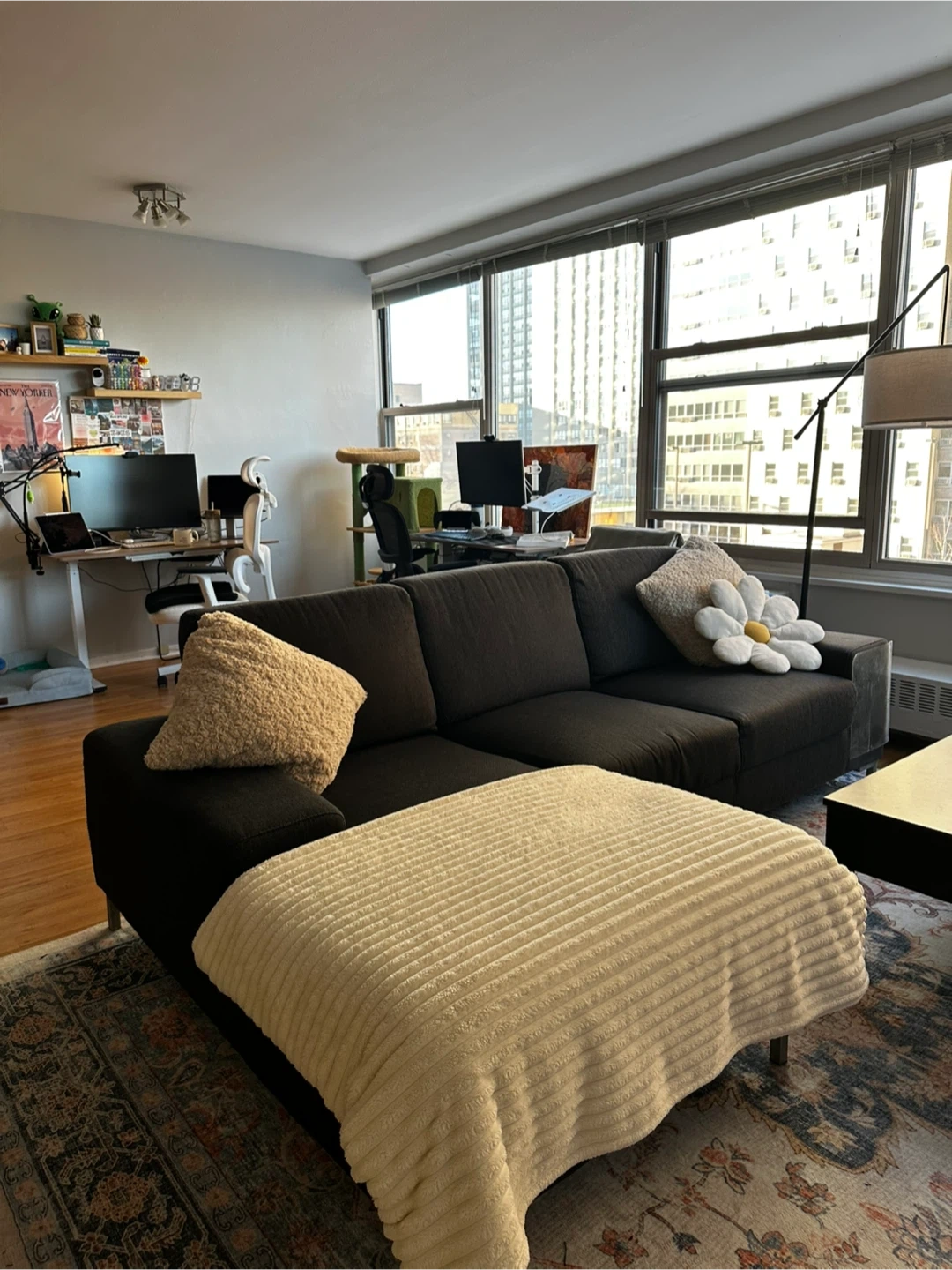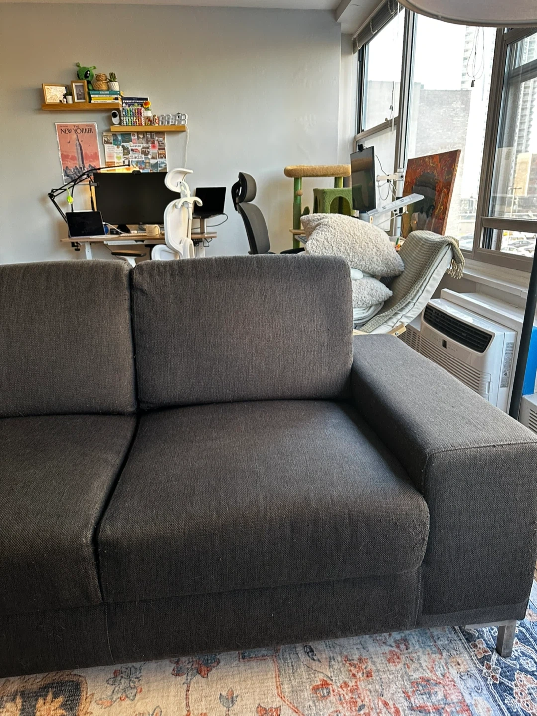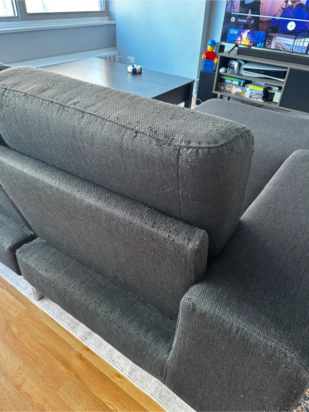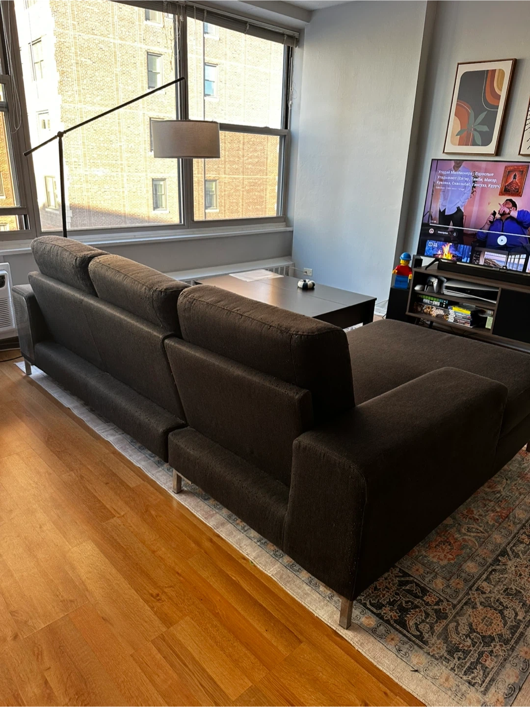 Comfortable dark gray fabric sectional sofa. It's a right-arm facing chaise with plenty of seating space. Comes with three accent pillows as shown.