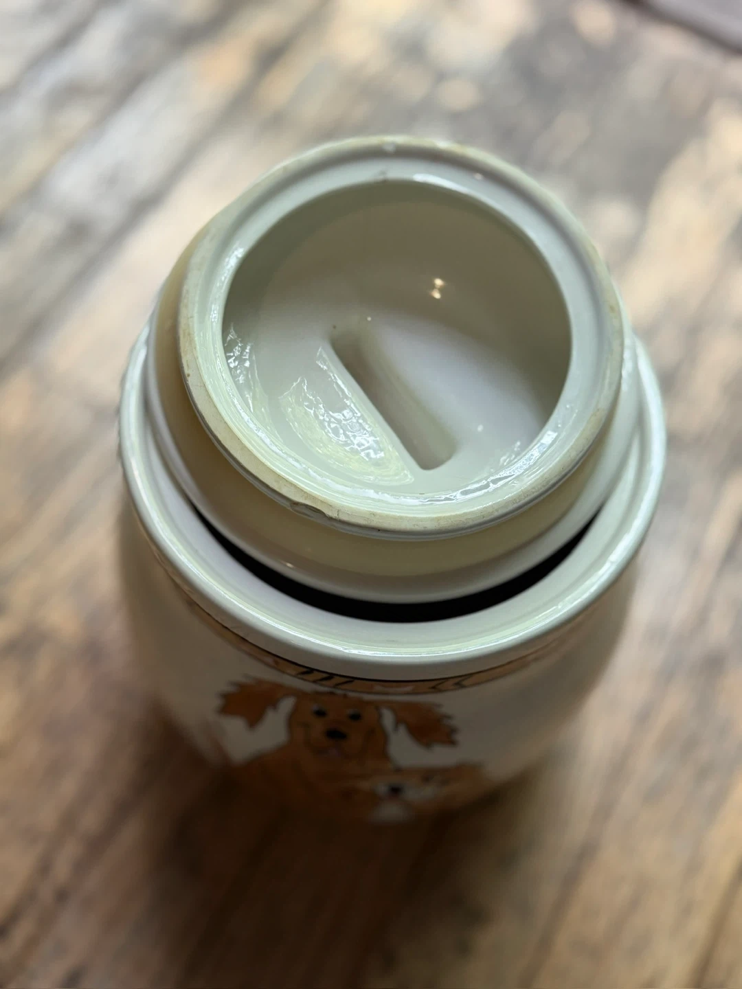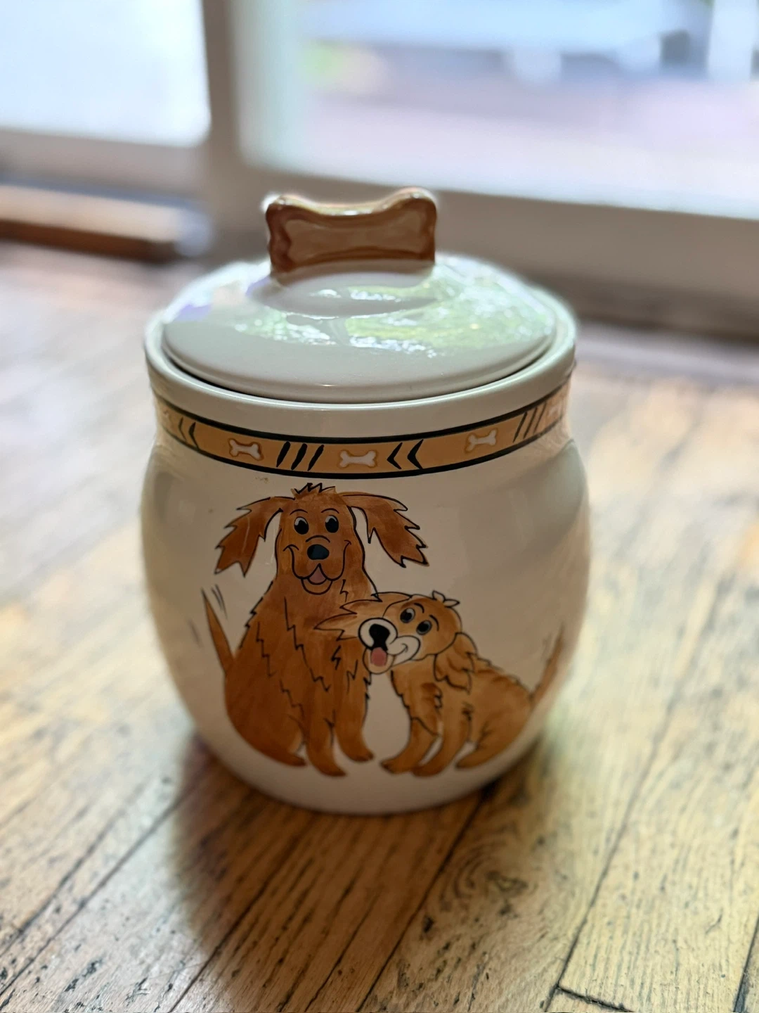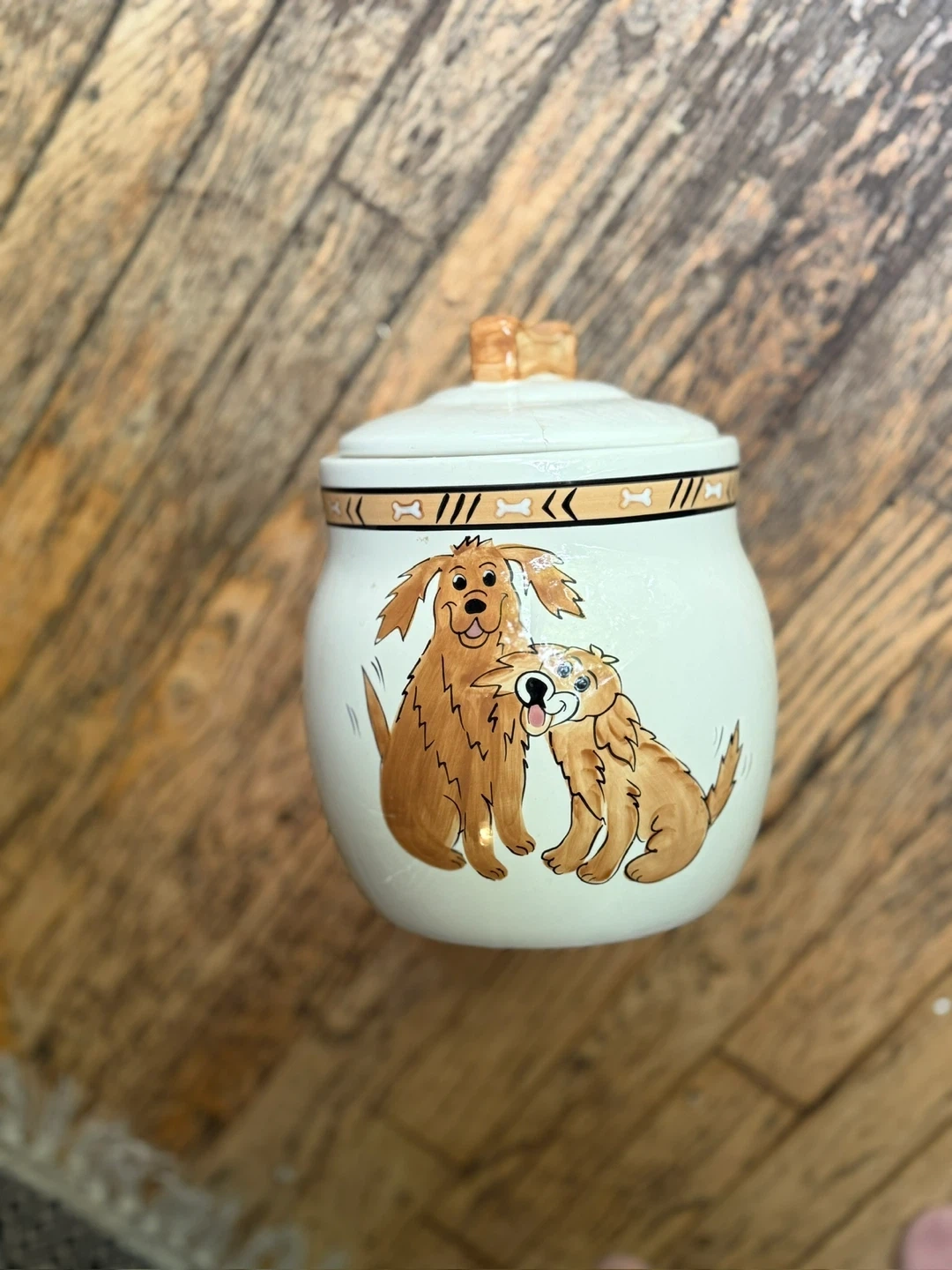 This Inspirado treat jar is perfect for keeping your furry friend's snacks fresh! It features a cute, hand-painted design of golden dogs and bones. It's made of clay.