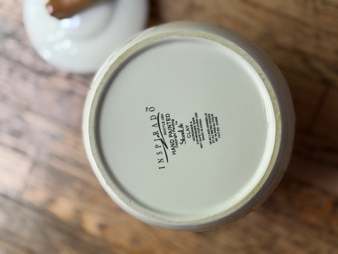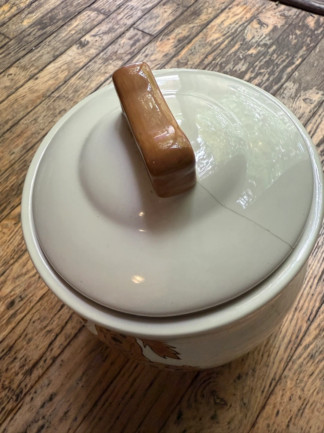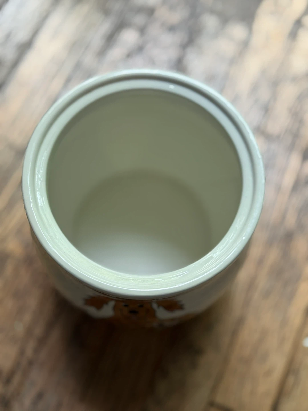 This Inspirado treat jar is perfect for keeping your furry friend's snacks fresh! It features a cute, hand-painted design of golden dogs and bones. It's made of clay.