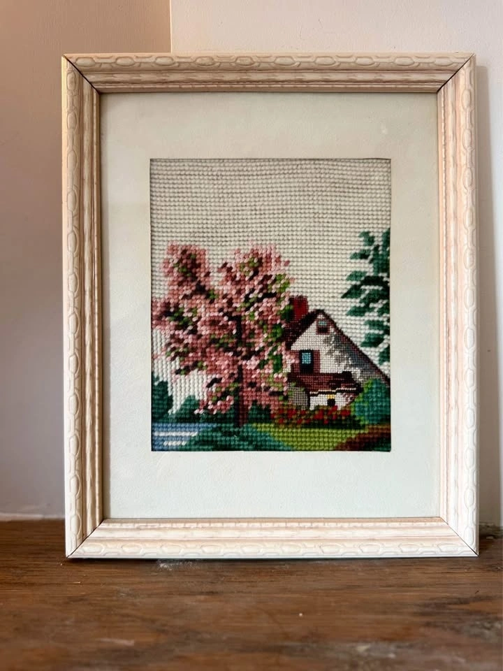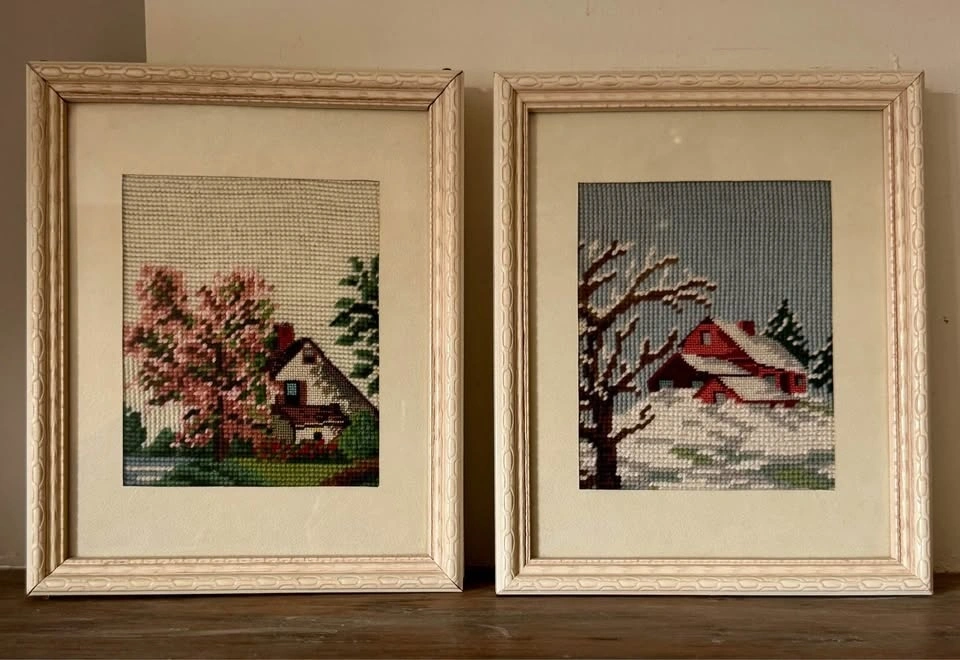 Needlepoint art, Vintage needlepoint, Framed needlepoint, Cottage art, Four seasons art, Hand-stitched art, Handmade wall art Cottagecore decor, Farmhouse wall decor, Shabby chic art, Traditional home decor, Embroidered art, Textile art, Scenic art, Landscape art, Countryside decor, Seasons decor, Spring art, Summer art, Autumn art, Winter art, Housewarming gift, Vintage gift, Collectible art, Ready to hang, MCM 1979s art,grand millennial Grandmillennial style, granny chic