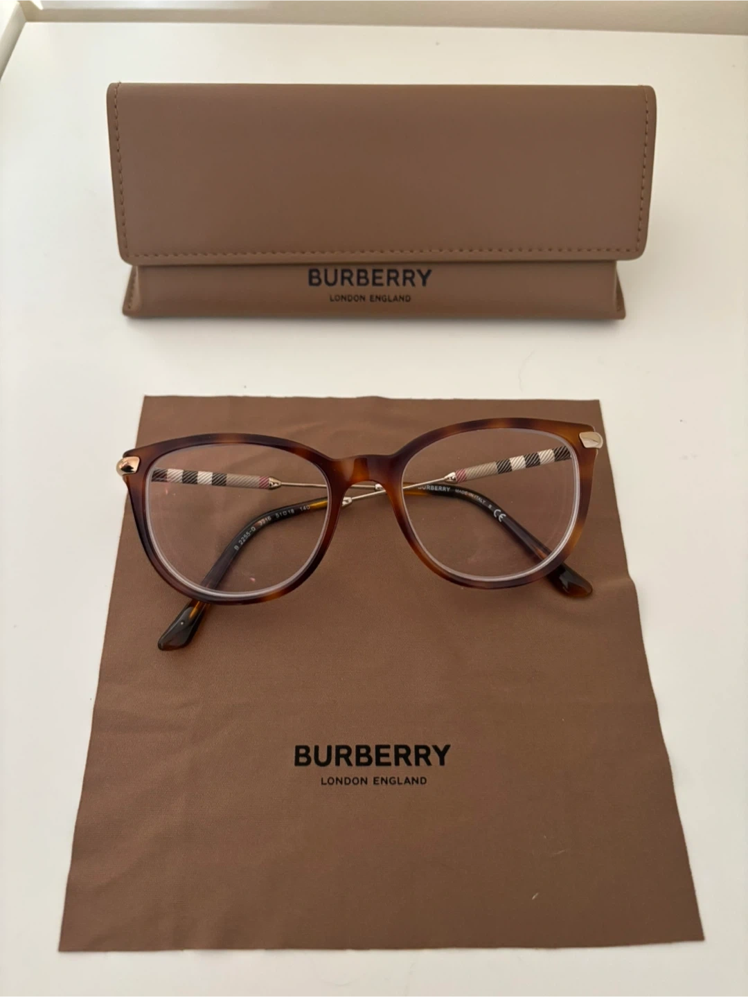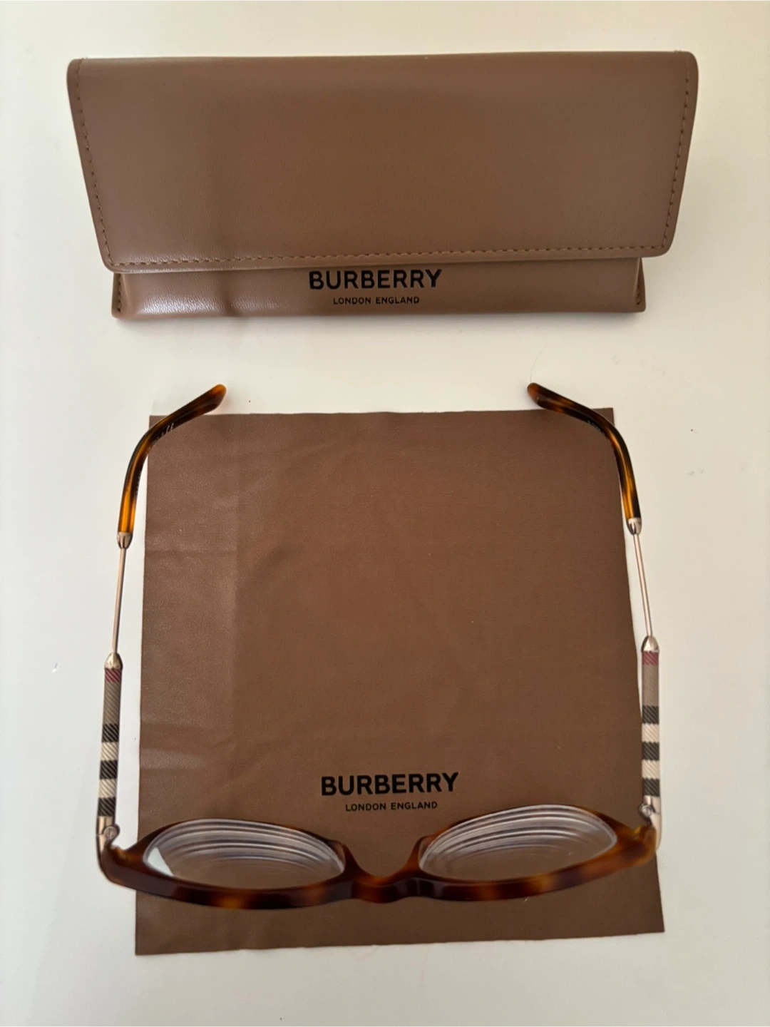 Burberry eyeglasses. They come with the original case and cleaning cloth. The lenses are prescription but can be easily switched out. Frame is a bit on the smaller side, great for smaller faces!