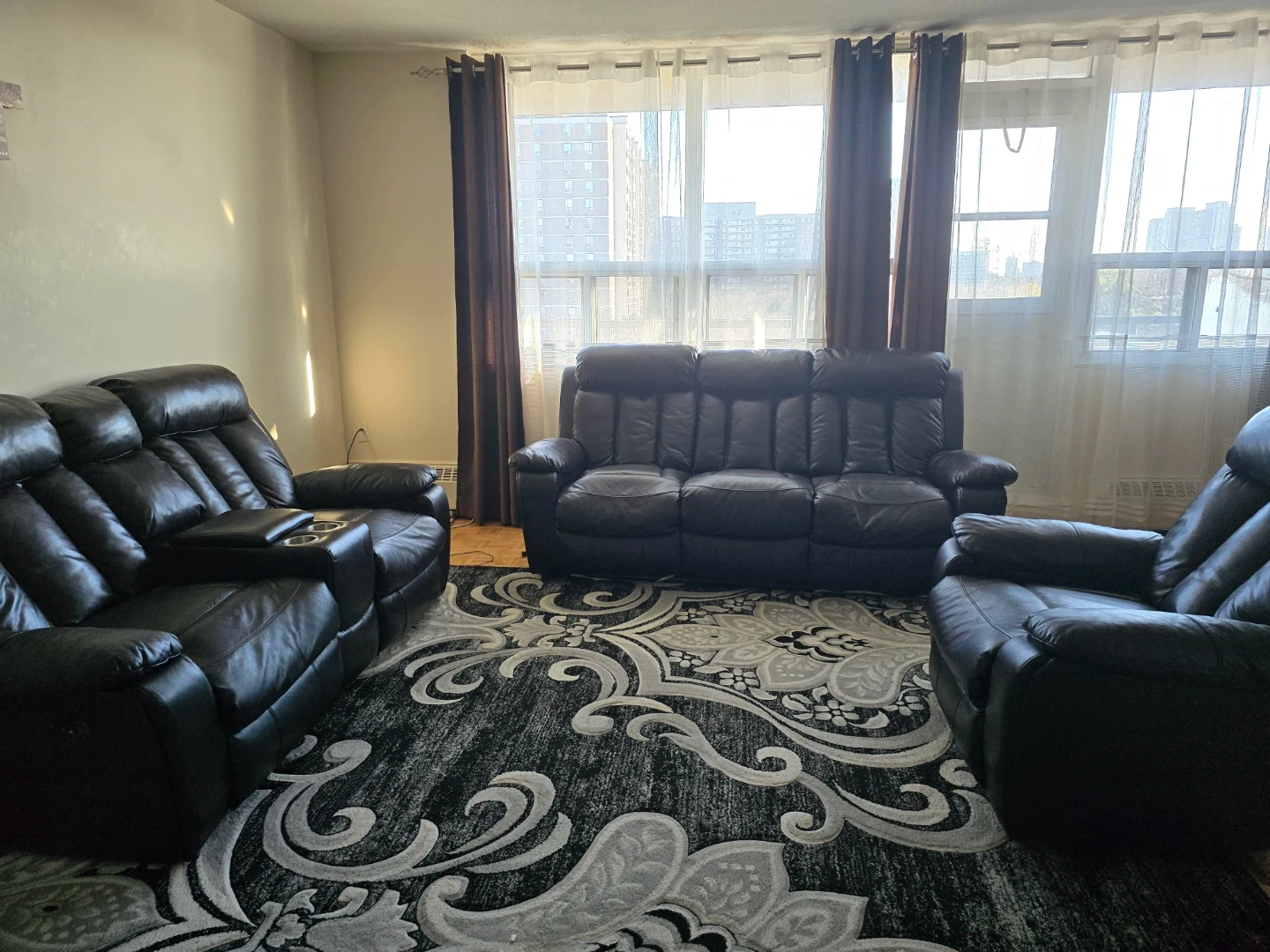 Selling a leather reclining sofa set that's in great condition! It includes a three-seater sofa with a middle console, and two individual reclining chairs. Perfect for a cozy living room setup!