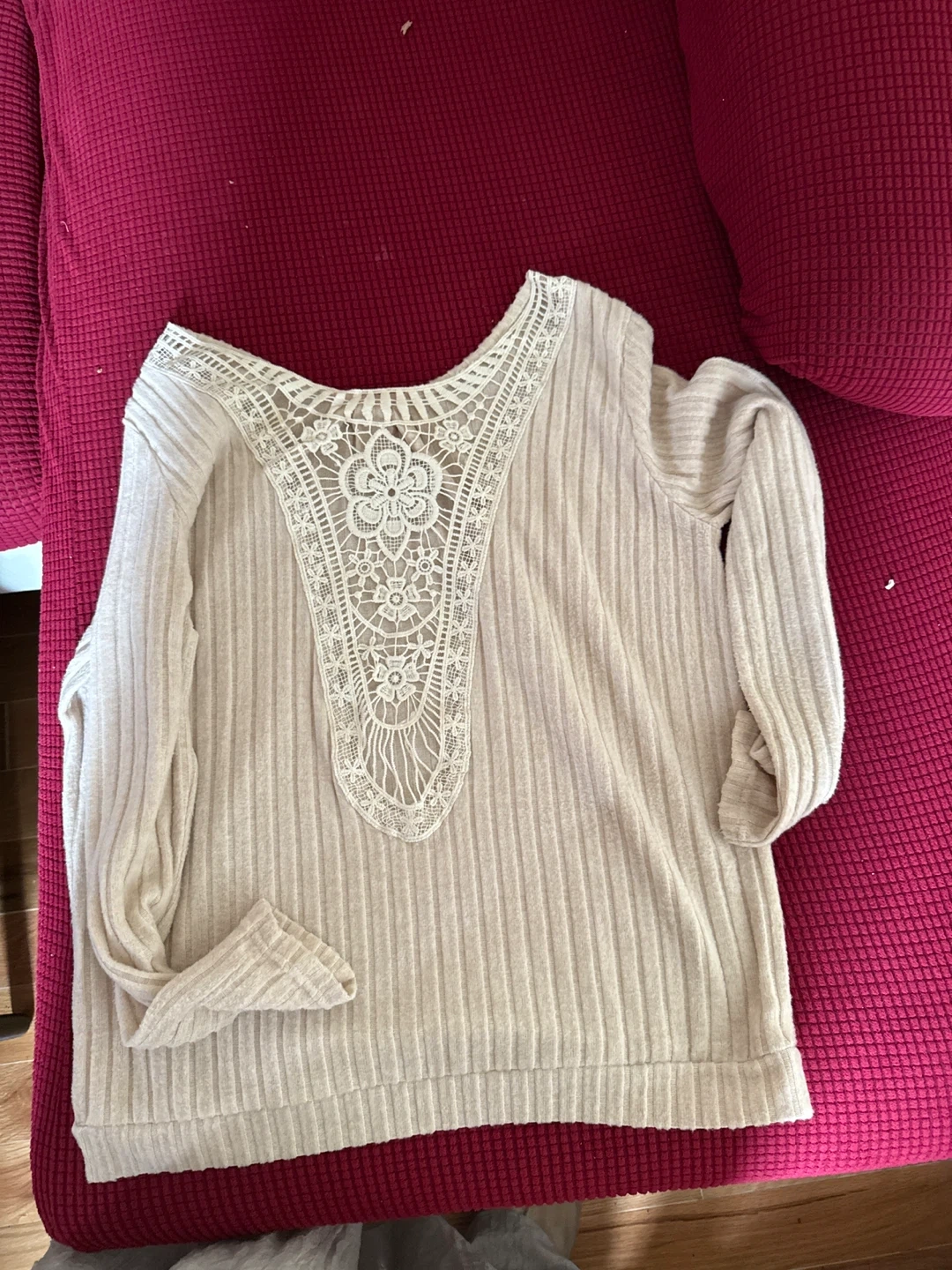 Selling a cream-colored long-sleeve top with a beautiful lace back design. It's in great condition and ready for a new wardrobe!