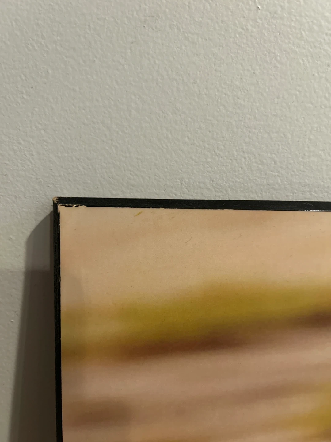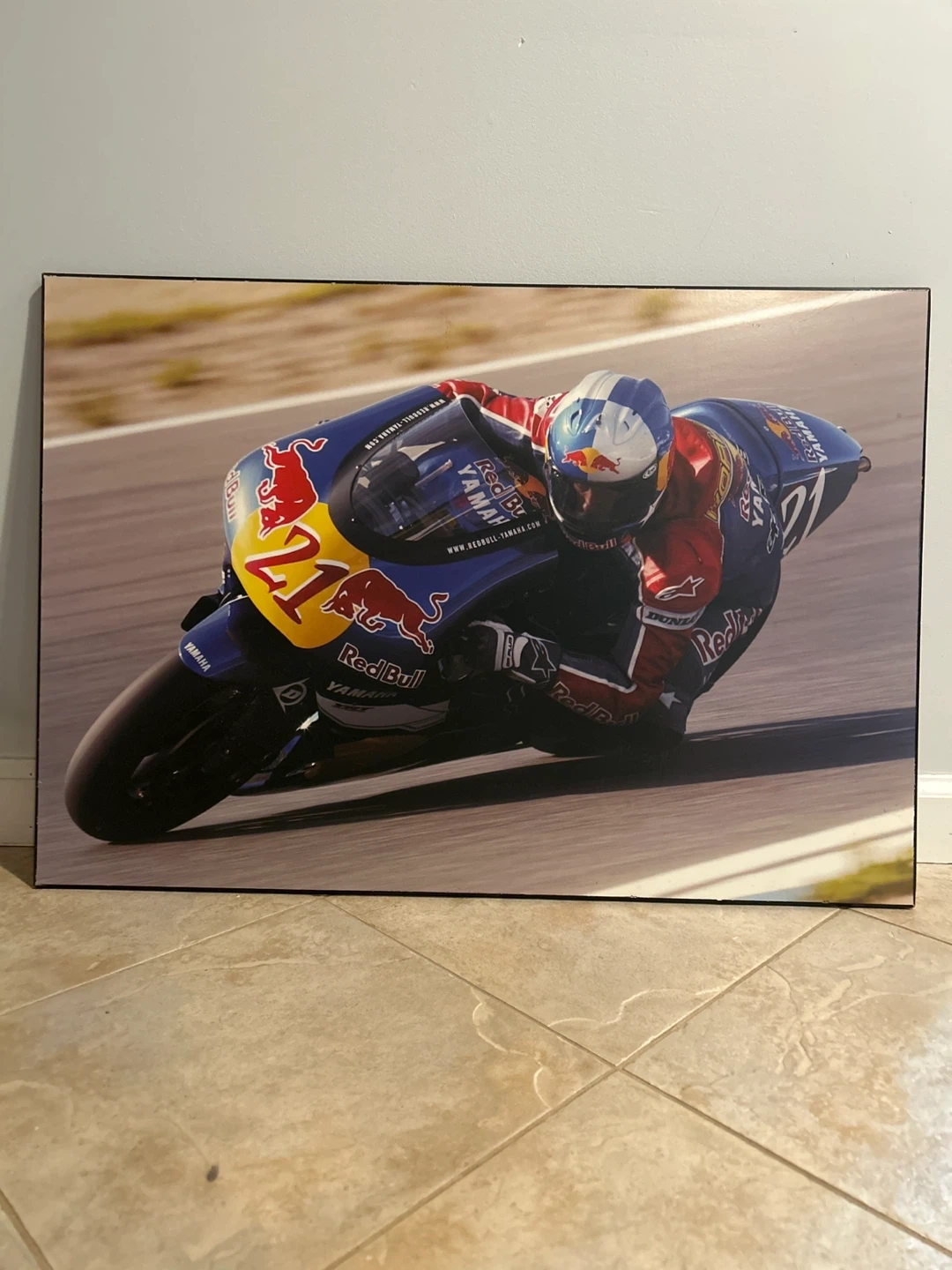 This is a framed poster of a Red Bull Yamaha motorcycle racing scene. It shows a racer in full gear, leaning into a turn on the track. The poster has some wear and tear on the corners, as shown in the photos.