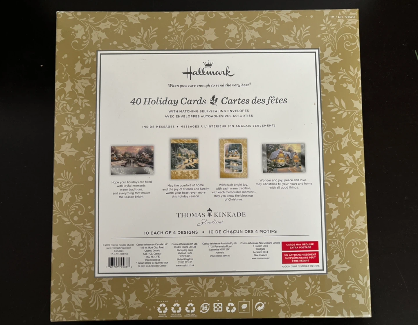 Open box of Hallmark holiday cards featuring the artwork of Thomas Kinkade. This set includes 27 cards with matching self-sealing envelopes.