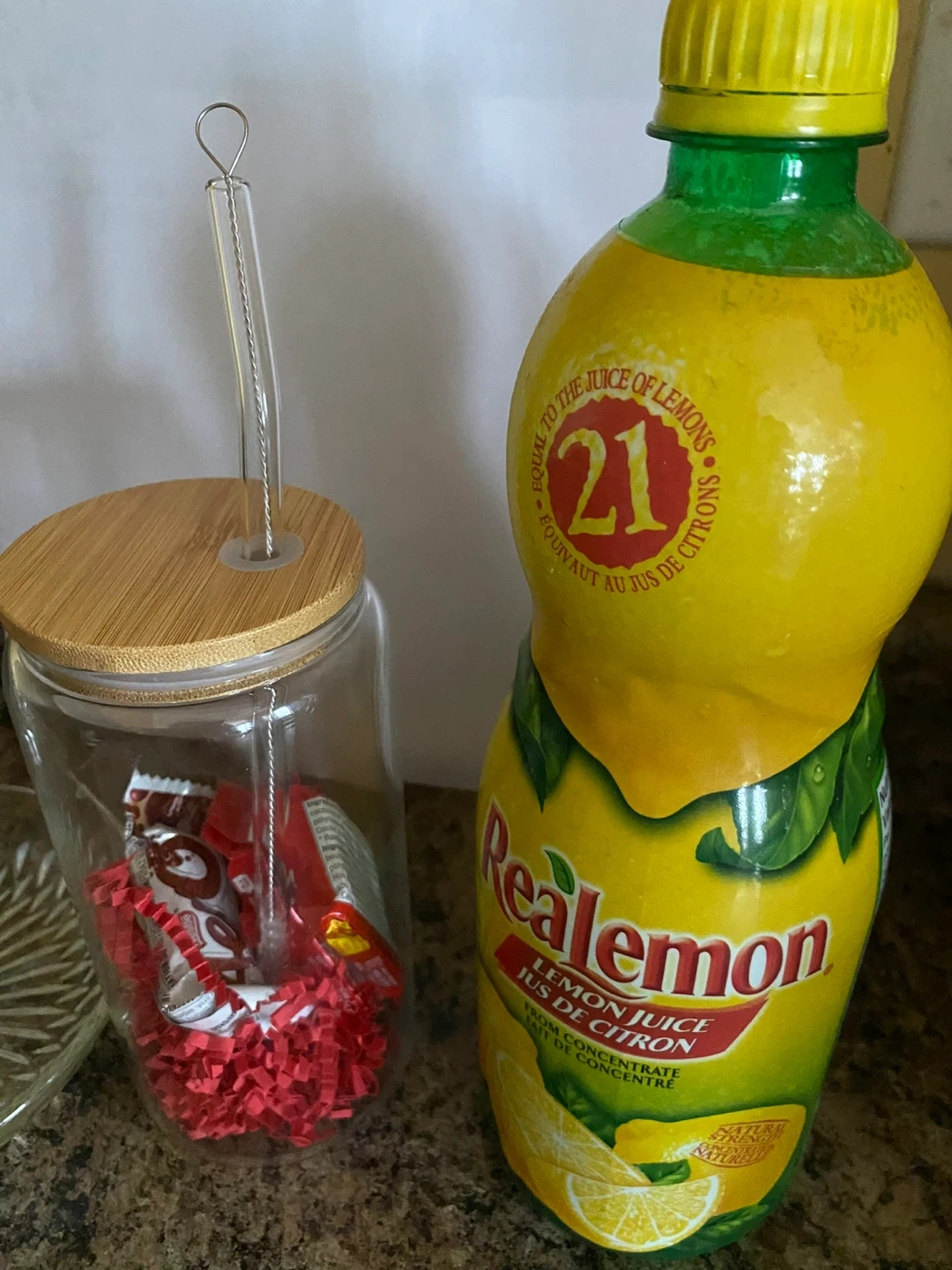 Selling a glass bowl with a floral design and a clear glass cup with a bamboo lid and straw - lemon juice bottle is just for height reference - (Christmas gift π )