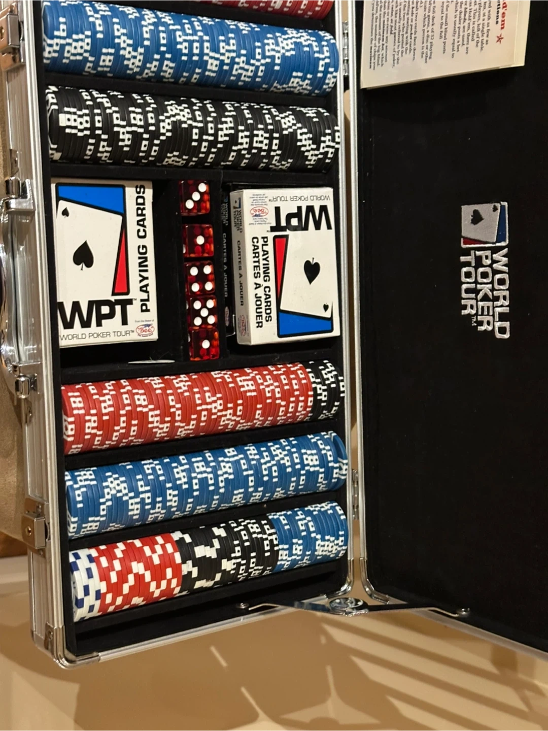 Selling a World Poker Tour poker set! It comes with a variety of chips, playing cards, and dice, all neatly organized in a carrying case. Perfect for poker nights with friends and family
