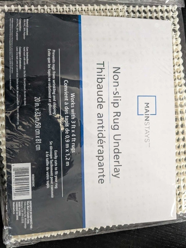 I'm selling two Mainstays non-slip rug underlays, each designed to prevent rugs from wrinkling and slipping, ensuring they stay exactly where you want them! These underlays are new and still in their original packaging, each sized at 20 inches by 32 inches (50 cm x 81 cm), perfect for smaller area rugs.