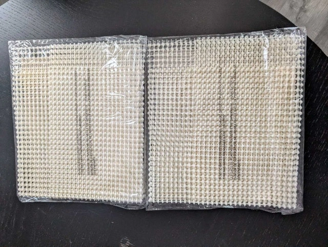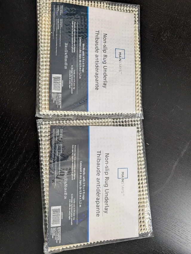 I'm selling two Mainstays non-slip rug underlays, each designed to prevent rugs from wrinkling and slipping, ensuring they stay exactly where you want them! These underlays are new and still in their original packaging, each sized at 20 inches by 32 inches (50 cm x 81 cm), perfect for smaller area rugs.
