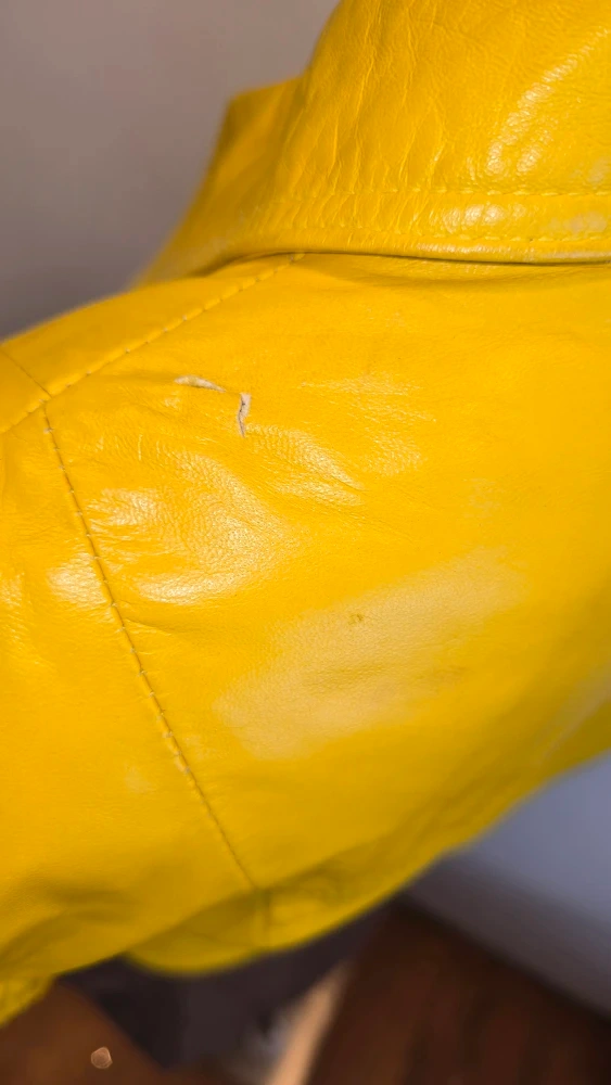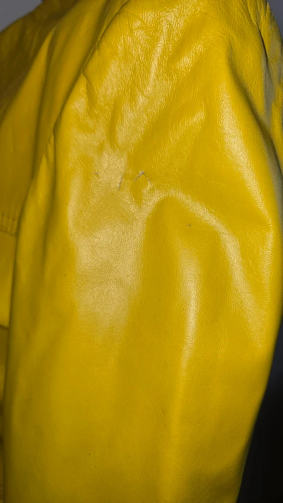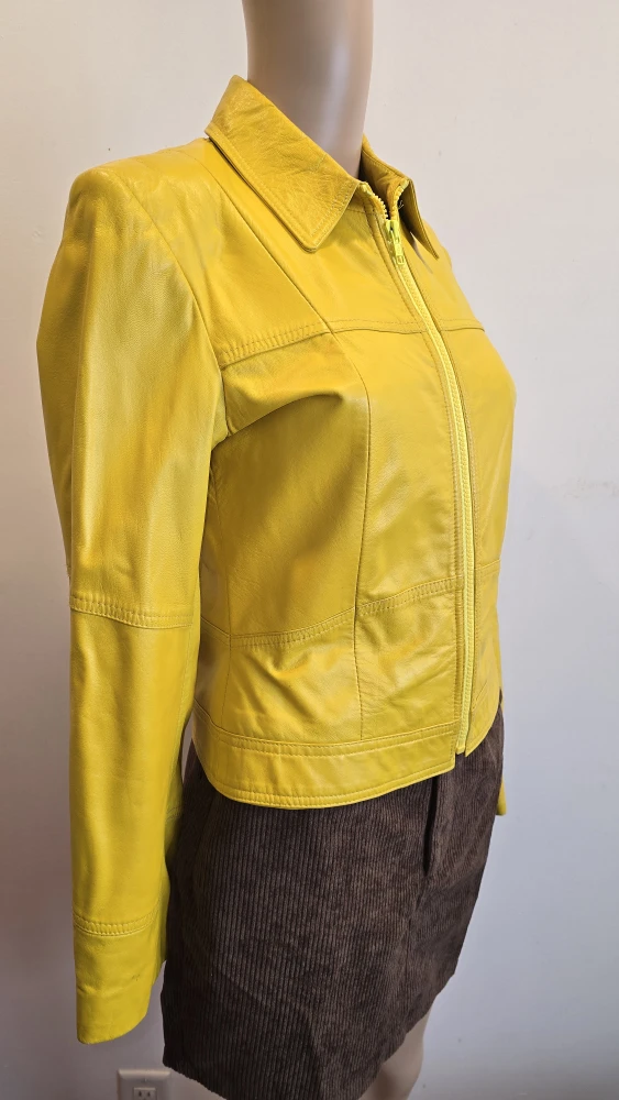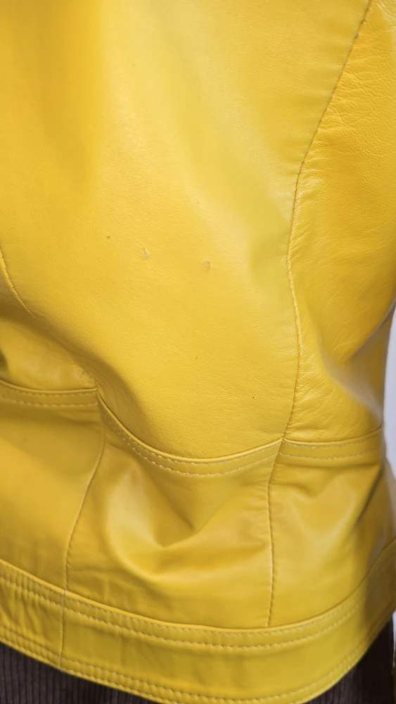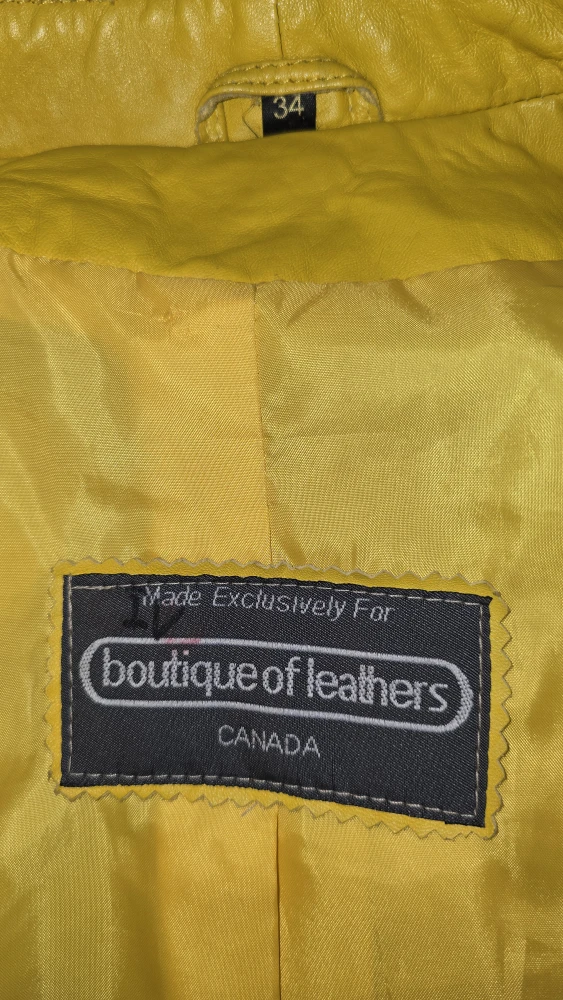 Size Xs vibrant yellow leather jacket from Boutique of Leathers. It's a size 34 and made exclusively for Boutique of Leathers Canada. There are some minor signs of wear, as shown in the photos.