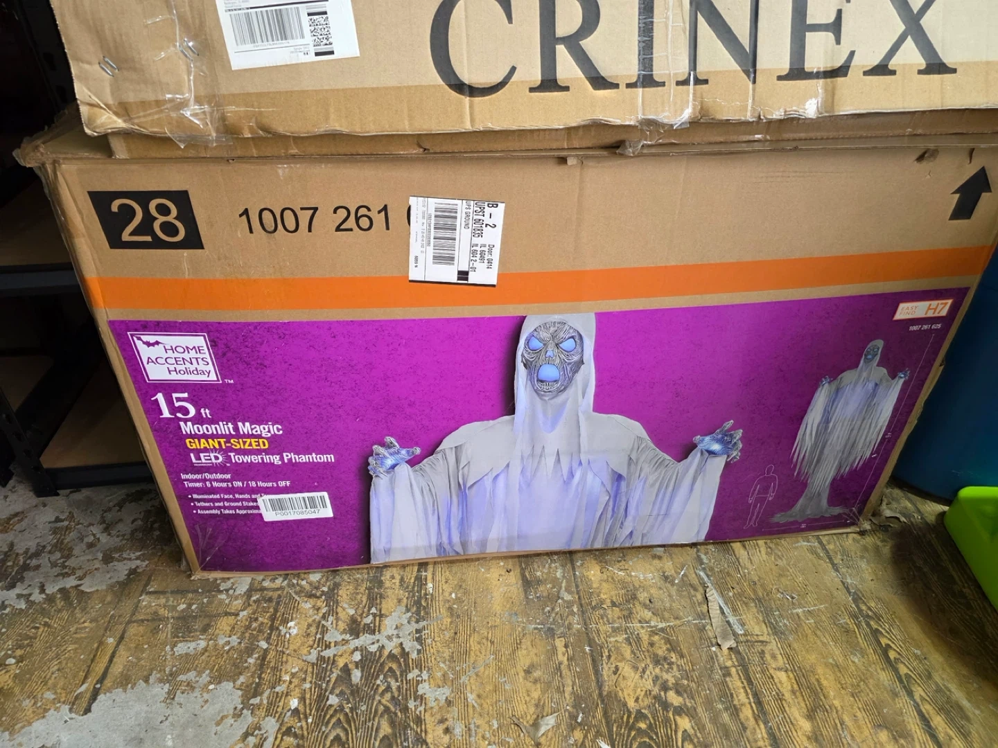 Selling a Home Accents Holiday 15 ft Moonlit Magic Giant-Sized LED Towering Phantom! It's indoor/outdoor and has a timer for 6 hours on and 18 hours off. It has an illuminated face and hands, and includes tethers and ground stakes. The assembly takes approximately P0017085047
