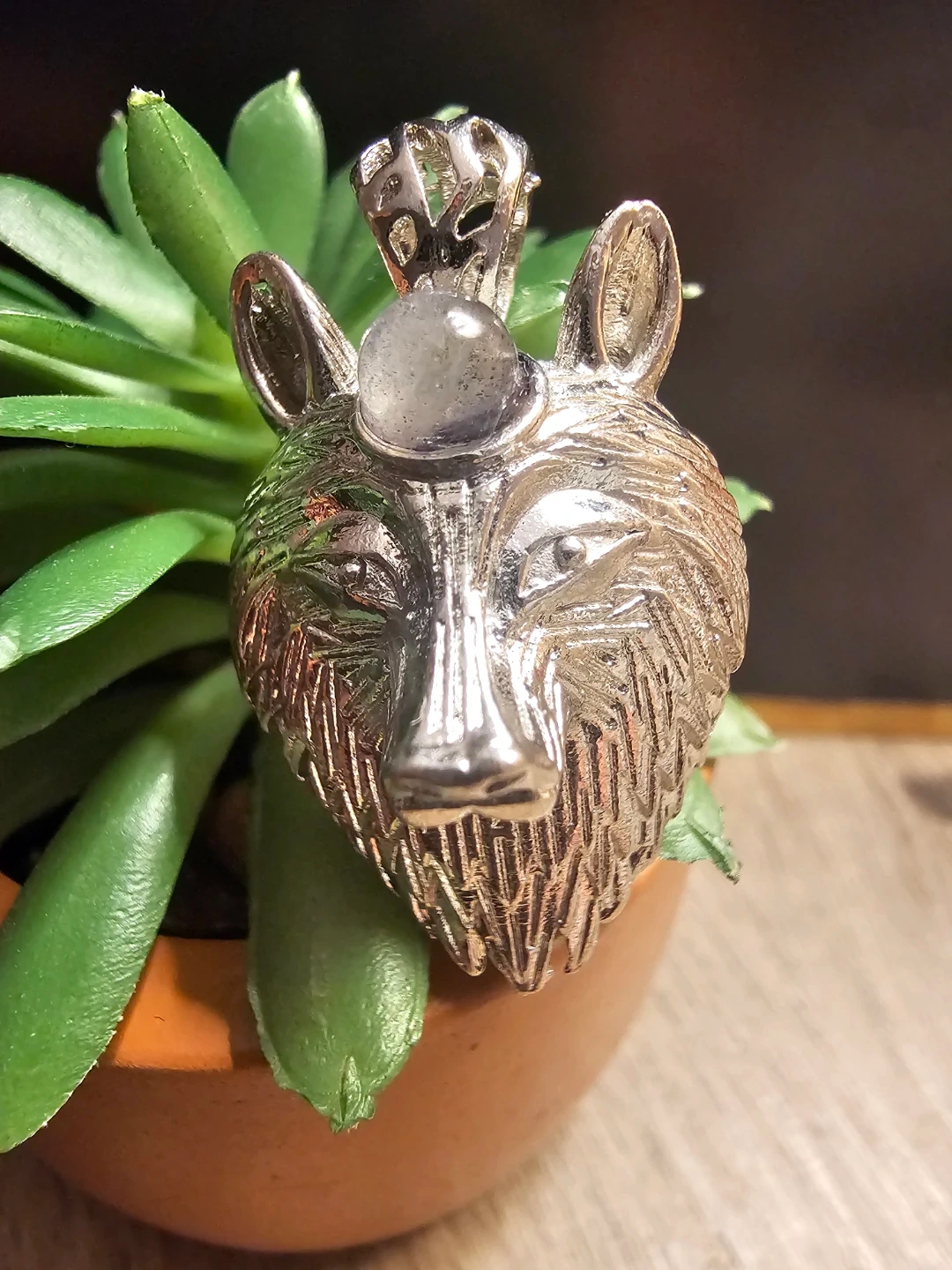 Here's a unique wolf head pendant! It features a detailed design and a labradorite crystal on the forehead. It's in great condition and ready to add some character to your style