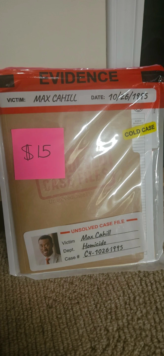 Selling an Unsolved Case File for the Max Cahill case. It's marked as a 'Cold Case' and includes a bonus envelope.