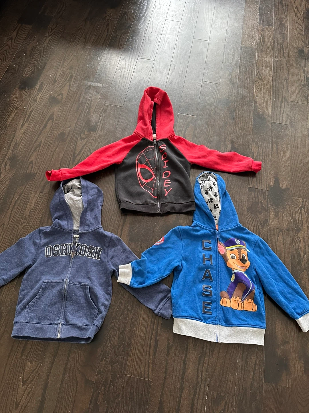 Selling a bundle of three kids' hoodies! There's a Spiderman hoodie (red and black), a Paw Patrol 'Chase' hoodie (blue), and a Carters OshKosh hoodie (blue). They're all in good condition and ready for a new home! Size 5T.