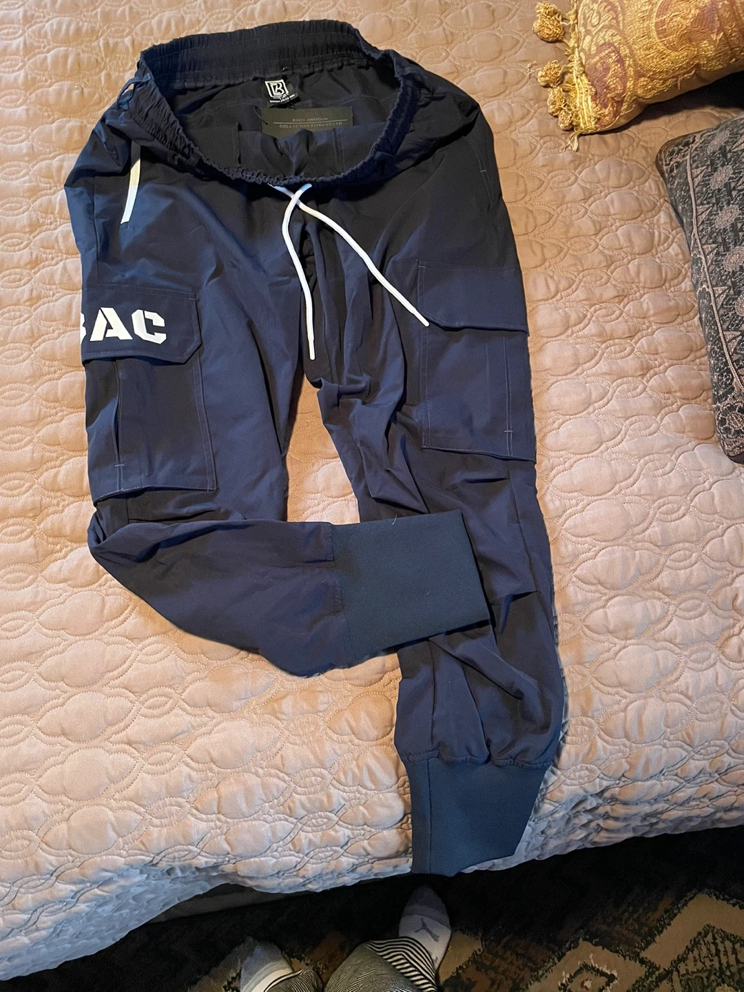 2 pairs Body Armour Collective Fitness cargo pants NEW with tags! These pants feature a comfortable elastic waistband and cuffs, along with multiple cargo pockets for all your essentials. The design includes the text "BUILD YOUR OWN BODY ARMOUR" on the cuff, adding a unique touch 2 pair (navy and black) womens Large