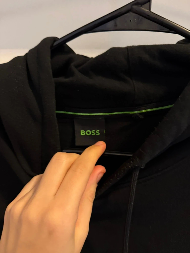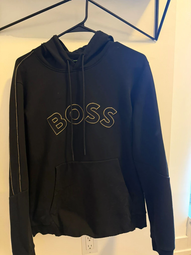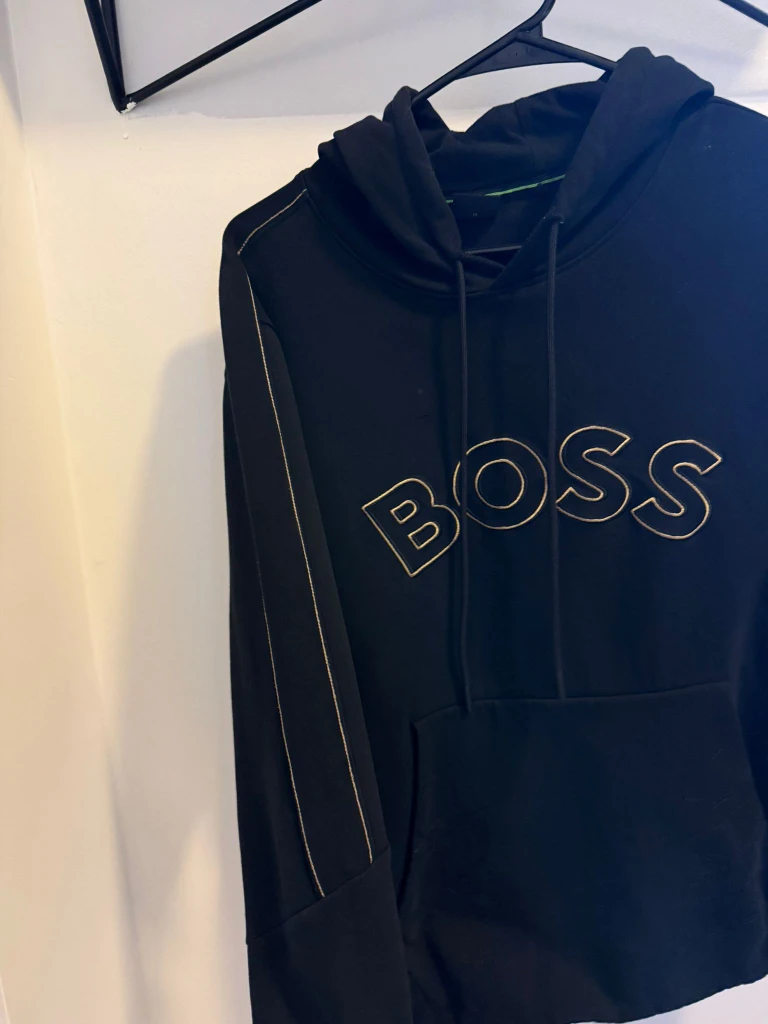 Selling a black BOSS hoodie in size medium. It's worn but still in great condition and has a stylish design with the BOSS logo on the front. Perfect for casual wear!