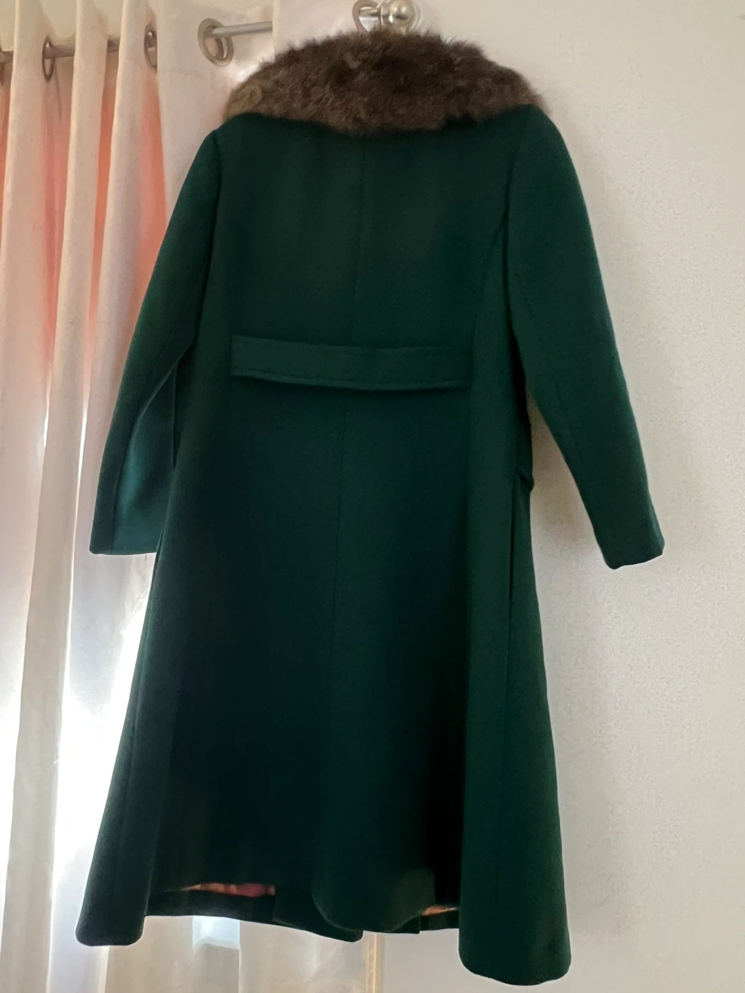 Selling a vintage green coat featuring a stylish fur collar. It's a unique piece that will add a touch of elegance to your wardrobe. The coat is in good condition and ready for a new owner!