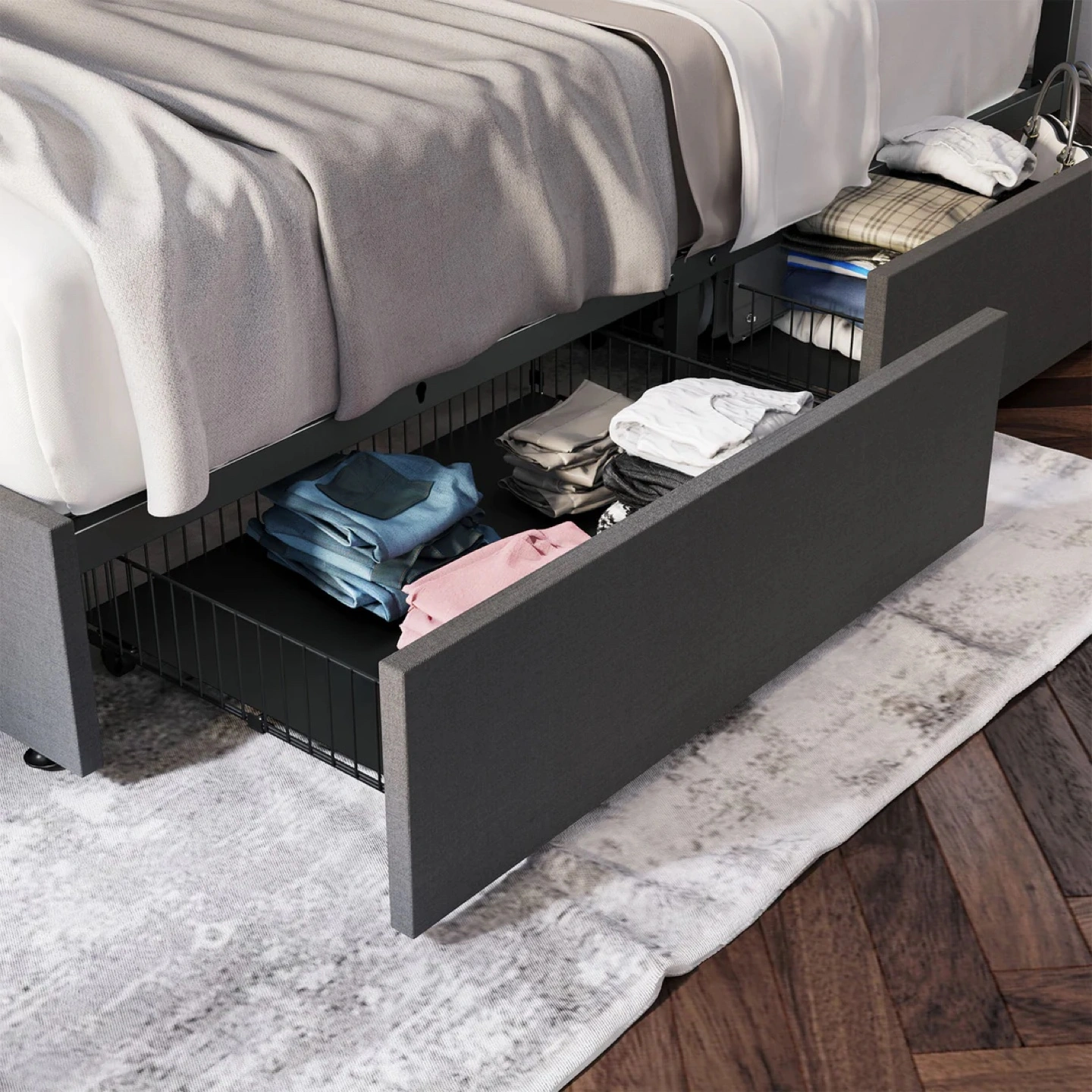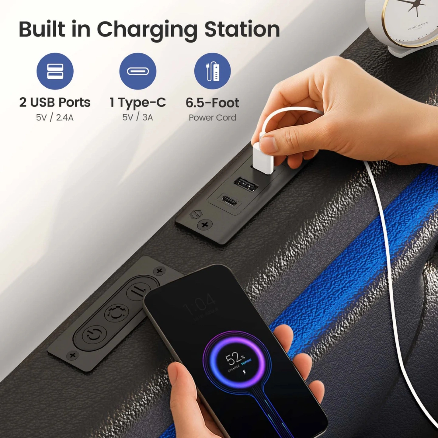 Selling a queen size bed frame. It includes a built-in charging station with 2 USB ports and 1 Type-C port. There are also convenient side pockets for storage and drawers for extra space. Dimensions are 84.10" x 62.40" x 41.70"