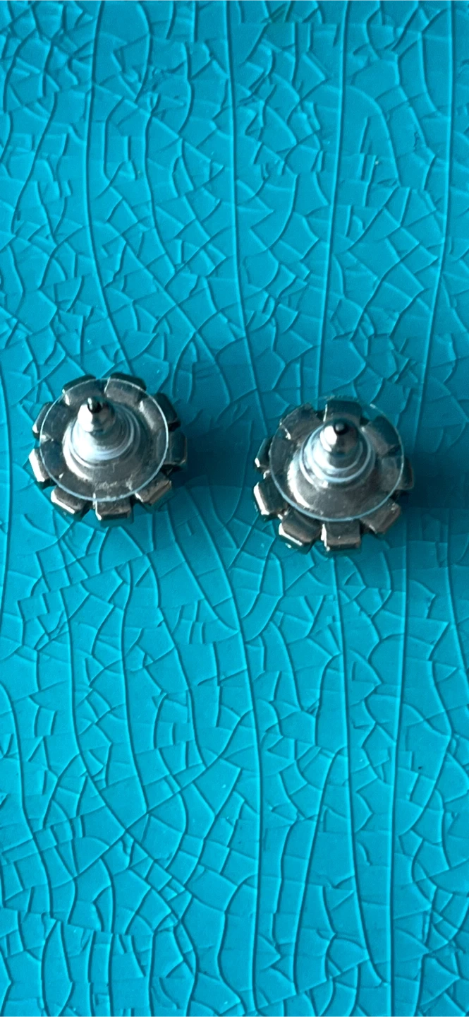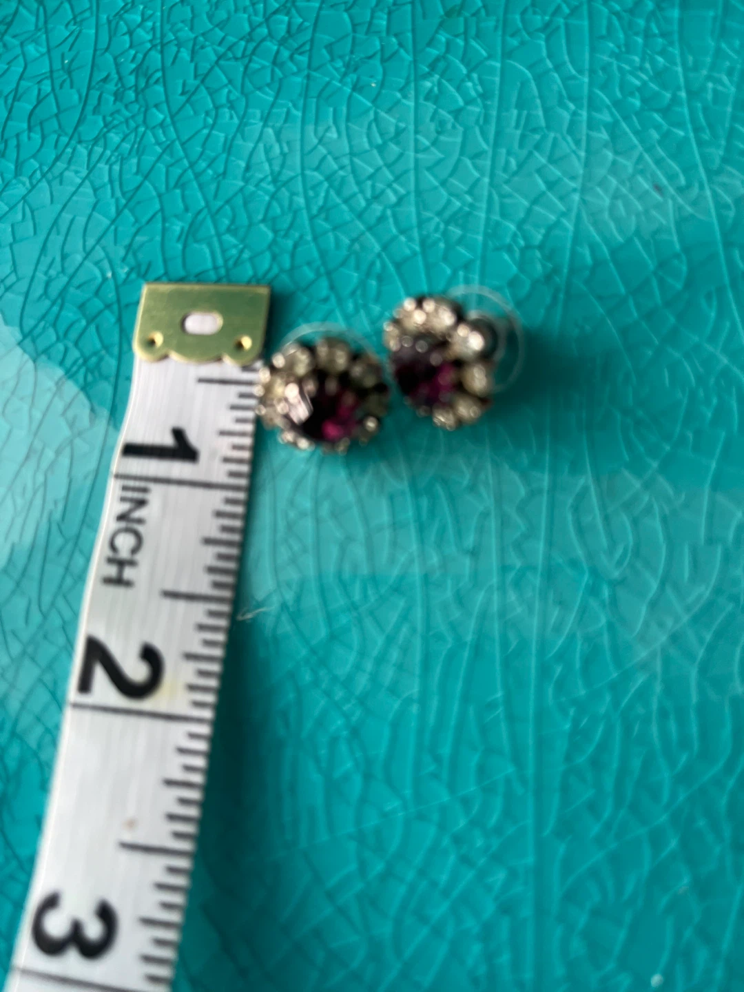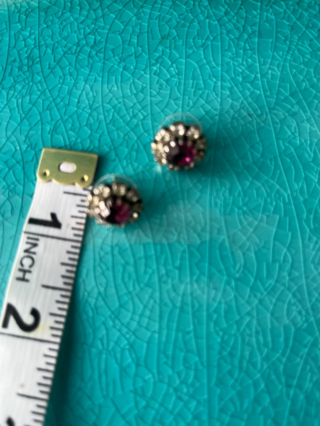 Cute pair of vintage stud earrings featuring a purple stone (amethyst?) surrounded by clear stones. They are approximately 1 inch in size.