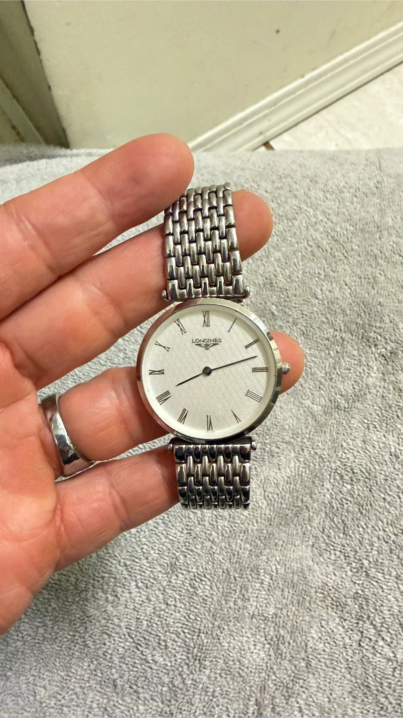 Sale as is a replica Longines ladies' watch with a silver band and face. It's in great condition and ready to wear! I’m not sure it’s still running or just needs a battery. Open for offers