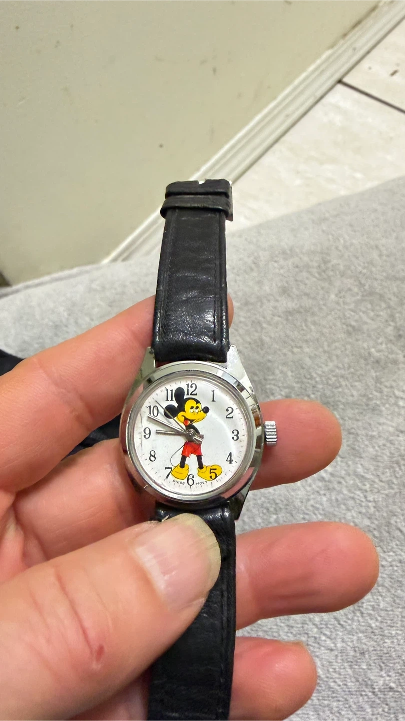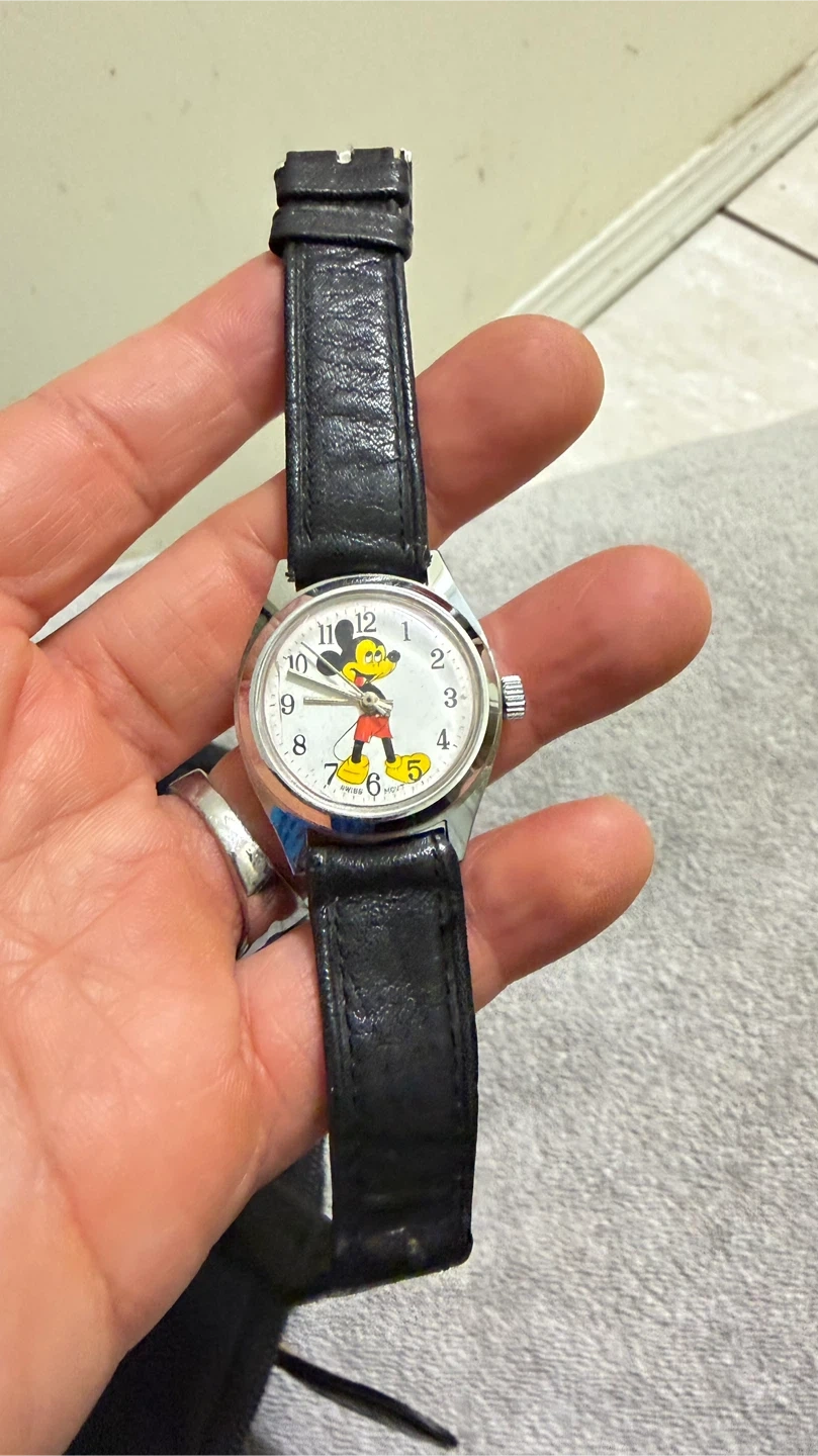 Selling an automatic vintage Mickey Mouse watch with a black leather strap. The watch face features Mickey Mouse in his classic pose. It shows some signs of wear, but it's still a fun piece! It’s not running condition.