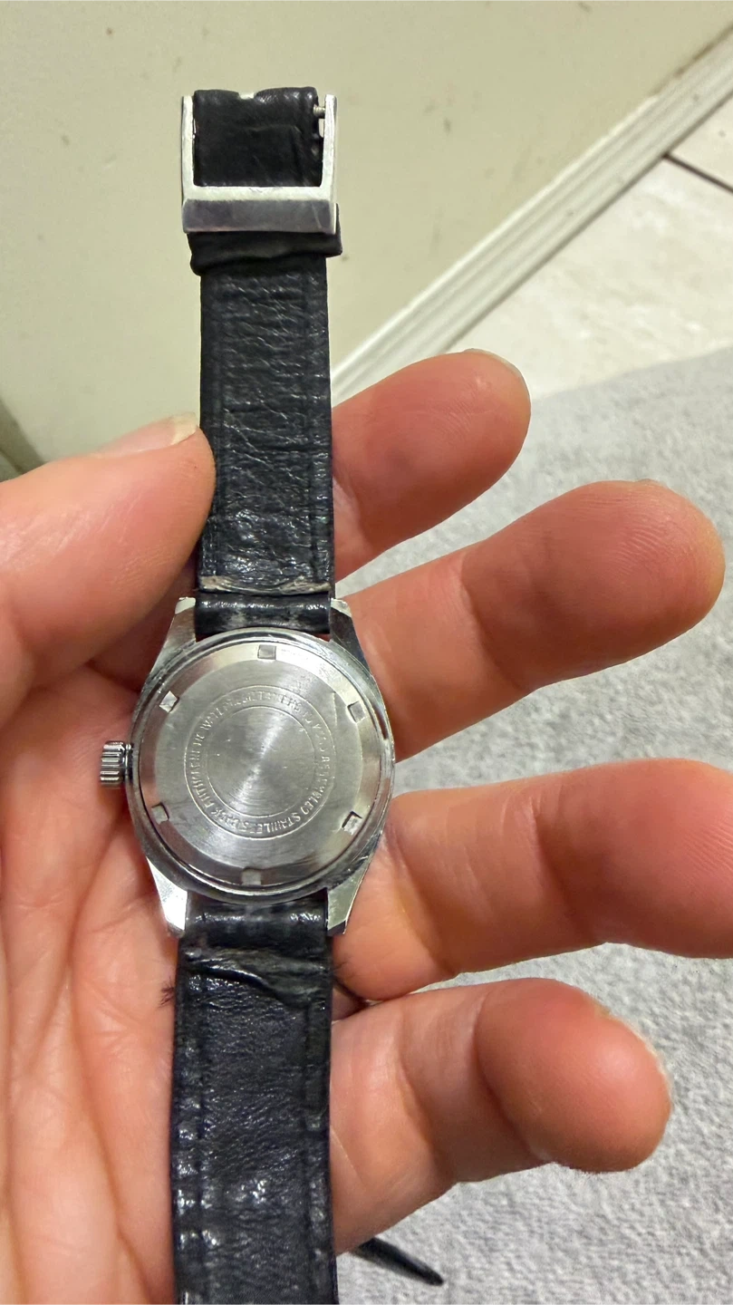 Selling an automatic vintage Mickey Mouse watch with a black leather strap. The watch face features Mickey Mouse in his classic pose. It shows some signs of wear, but it's still a fun piece! It’s not running condition.