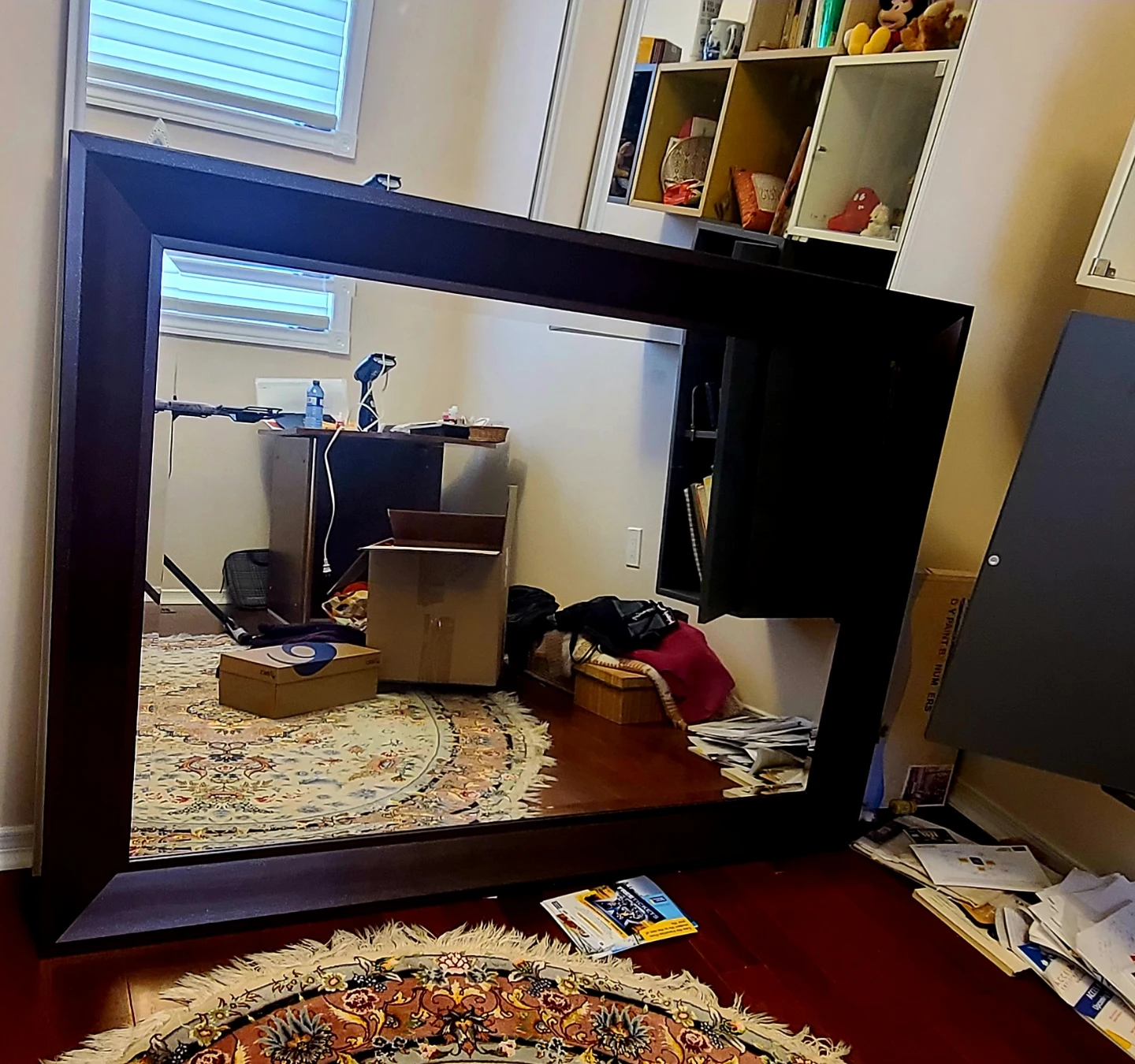 Selling a large framed mirror with a dark brown frame. It's in great condition and would look lovely in any room. The frame is quite substantial, giving it a nice, solid feel.