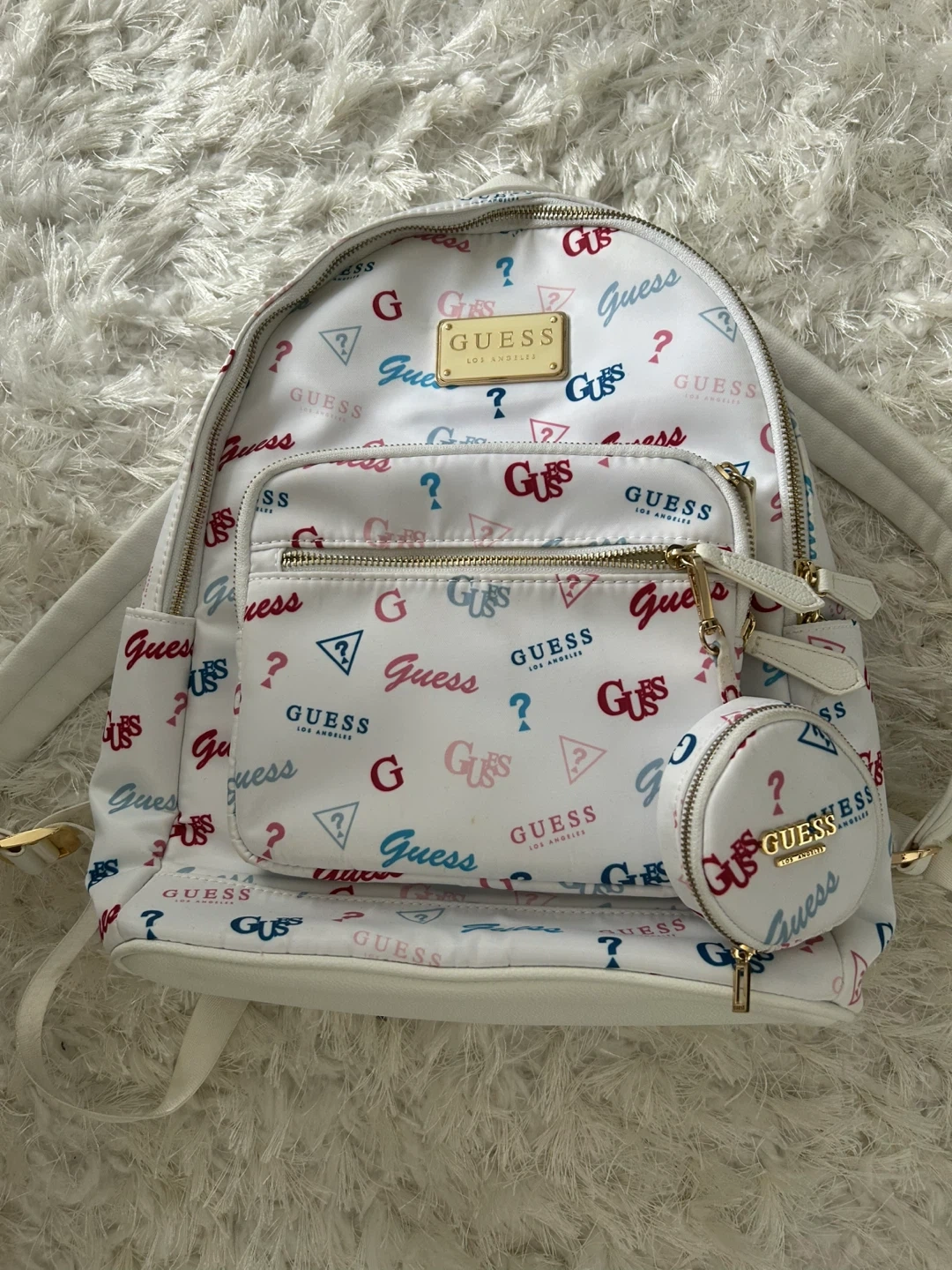 Cute Guess backpack in white with a fun logo print! Perfect for everyday use or as a stylish accessory. It features a front pocket and a small coin purse. In great condition! Pick up Whitby