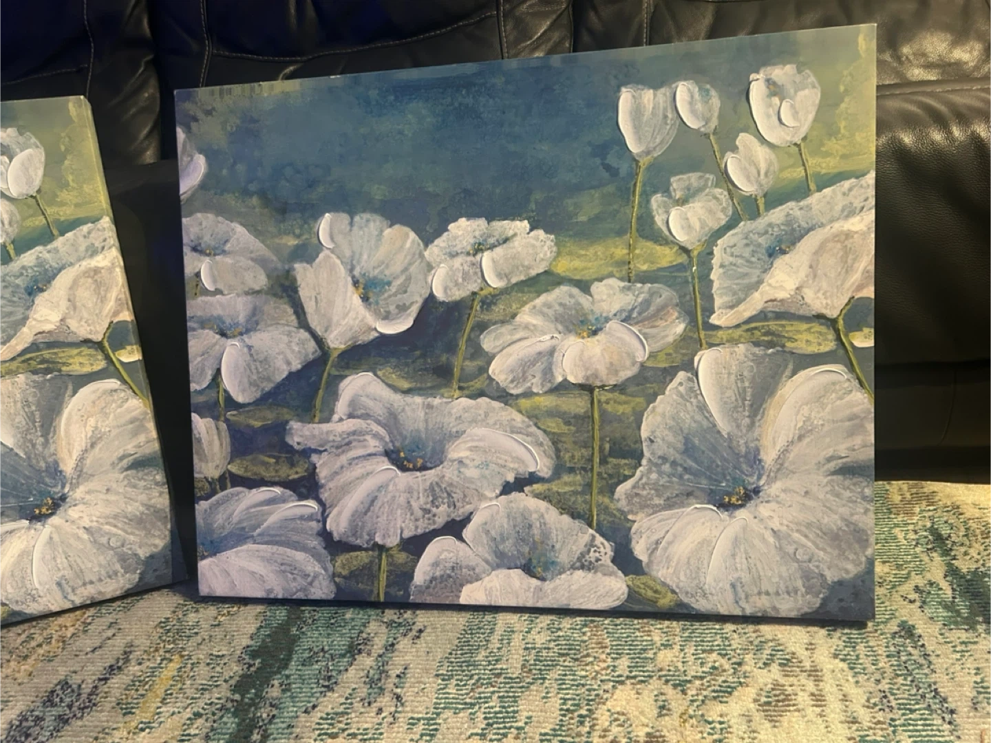 Selling a set of two floral canvas wall art pieces. They feature beautiful white flowers against a blue and green background. Perfect for adding a touch of nature to your home decor!