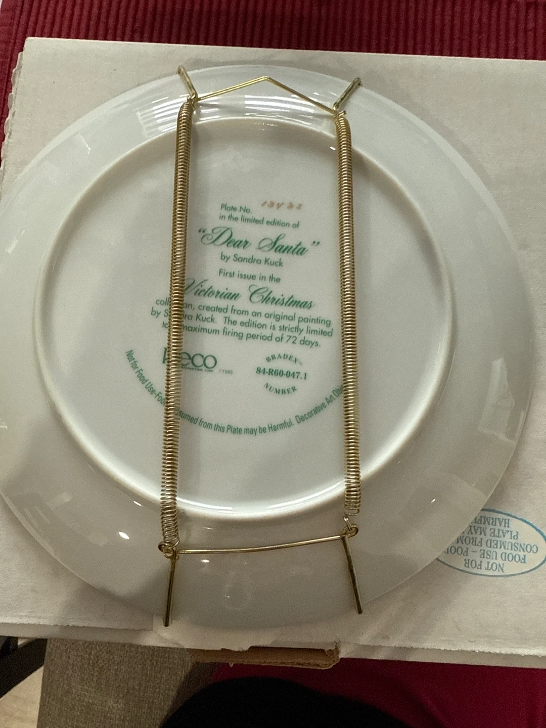 Selling a collector plate titled "Dear Santa" by Sandra Kuck. This plate is from the Victorian Christmas collection and is the first issue in the series. The plate number is 134 DS and it comes with a certificate of authenticity. It was created from an original work by the artist and issued by Reco International.