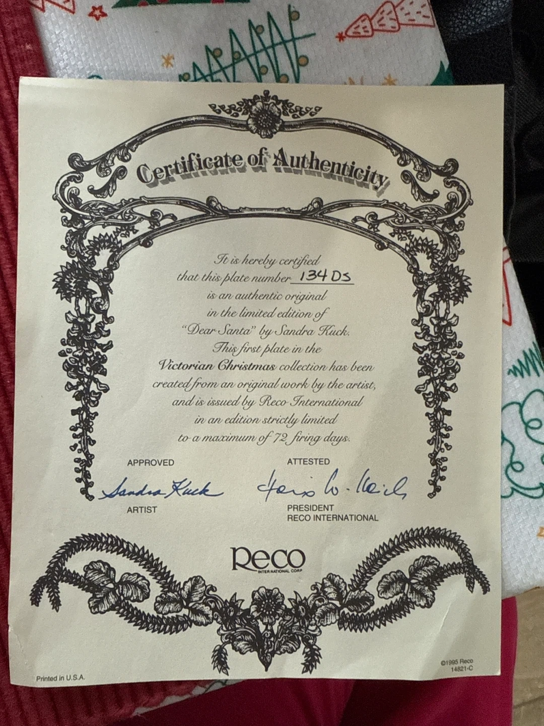 Selling a collector plate titled "Dear Santa" by Sandra Kuck. This plate is from the Victorian Christmas collection and is the first issue in the series. The plate number is 134 DS and it comes with a certificate of authenticity. It was created from an original work by the artist and issued by Reco International.